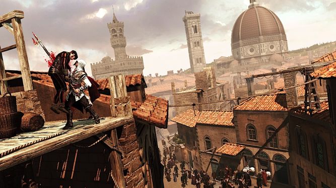 Dwa słowa powiedzieć wypada również na temat usprawnionej i poprawionej mechaniki wtapiania się w tłum. Ezio nie będzie skazany wyłącznie na obecnych w pobliżu mnichów, do których dołączał jego przodek. Teraz będziemy mogli wtopić się w każdą ciżbę ludzką, byle tylko zrobić to delikatnie i cichaczem. Co więcej – w sequelu zaimplementowano ciekawą możliwość manipulowania ludźmi znajdującymi się w pobliżu. Na czym ten ficzers miałby polegać? Otóż można skłonić NPC-ów do robienia tego, na czym nam w danej chwili zależy. Jeśli np. chcemy, by złodzieje zajęli się strażnikami, wystarczy im za to zapłacić. Również wprowadzenie ciżby w stan wielkiego wrzenia okaże się proste – wystarczy bowiem rozsypać na ziemi garść monet.