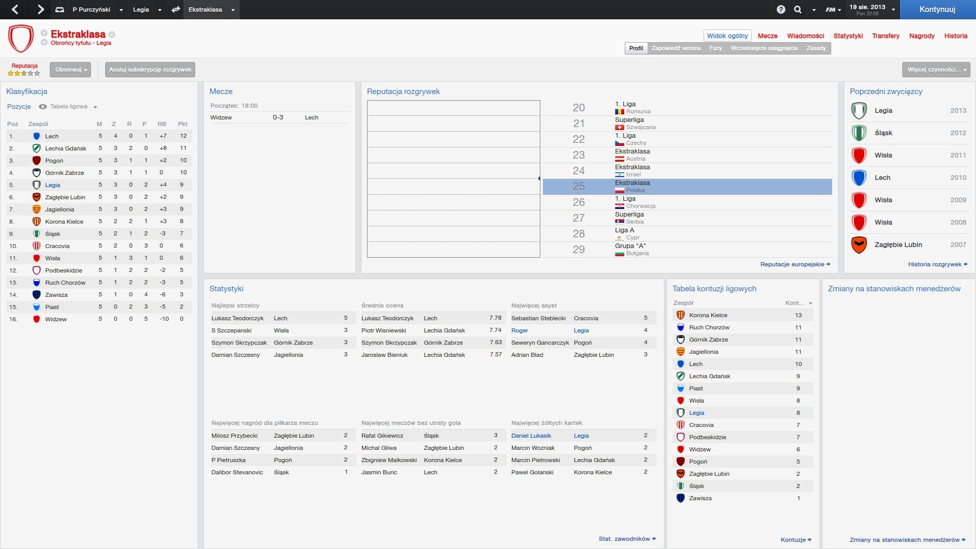 Skybet publikuje przedsezonowe prognozy: u bukmachera jesteśmy faworytem do mistrzostwa Polski ze współczynnikiem 6-4. Drugi jest Lech Poznań (7-4), a trzeci Śląsk Wrocław (3-1). Już w pierwszym meczu sezonu objawia się nasz kryzys w defensywie. Na szczęście na dwa gole Widzewa odpowiadamy trzema i na inaugurację zgarniamy komplet punktów. W eliminacjach do Ligi Mistrzów korzystamy z uroków szczęśliwego losowania i kolejnych rywali - estońskie Kalju i mołdawskie Sheriff Tyraspol - odprawiamy z kwitkiem. W decydującej rundzie również trafiamy nie najgorzej - na białoruskie BATE Borysów. Polskie drużyny najwyraźniej mają jednak w DNA, by nie awansować do fazy grupowej, a twórcy Football Managera o tym chyba wiedzą. Dwa razy złamana linia spalonego, stały fragment i błąd indywidualny obrońcy, i z wyjazdu za wschodnią granicę wracamy z bardzo niekorzystnym wynikiem: 1:4. W rewanżu pozostaje nam bronić honoru, a nasze drużyny słyną z udanych meczów o honor. Tym razem również udało nam się podtrzymać tradycję, a rewanż przy Łazienkowskiej kończy się hokejowym wynikiem 4:3 dla Legii. Cóż, trzeba się szykować na Ligę Europy.