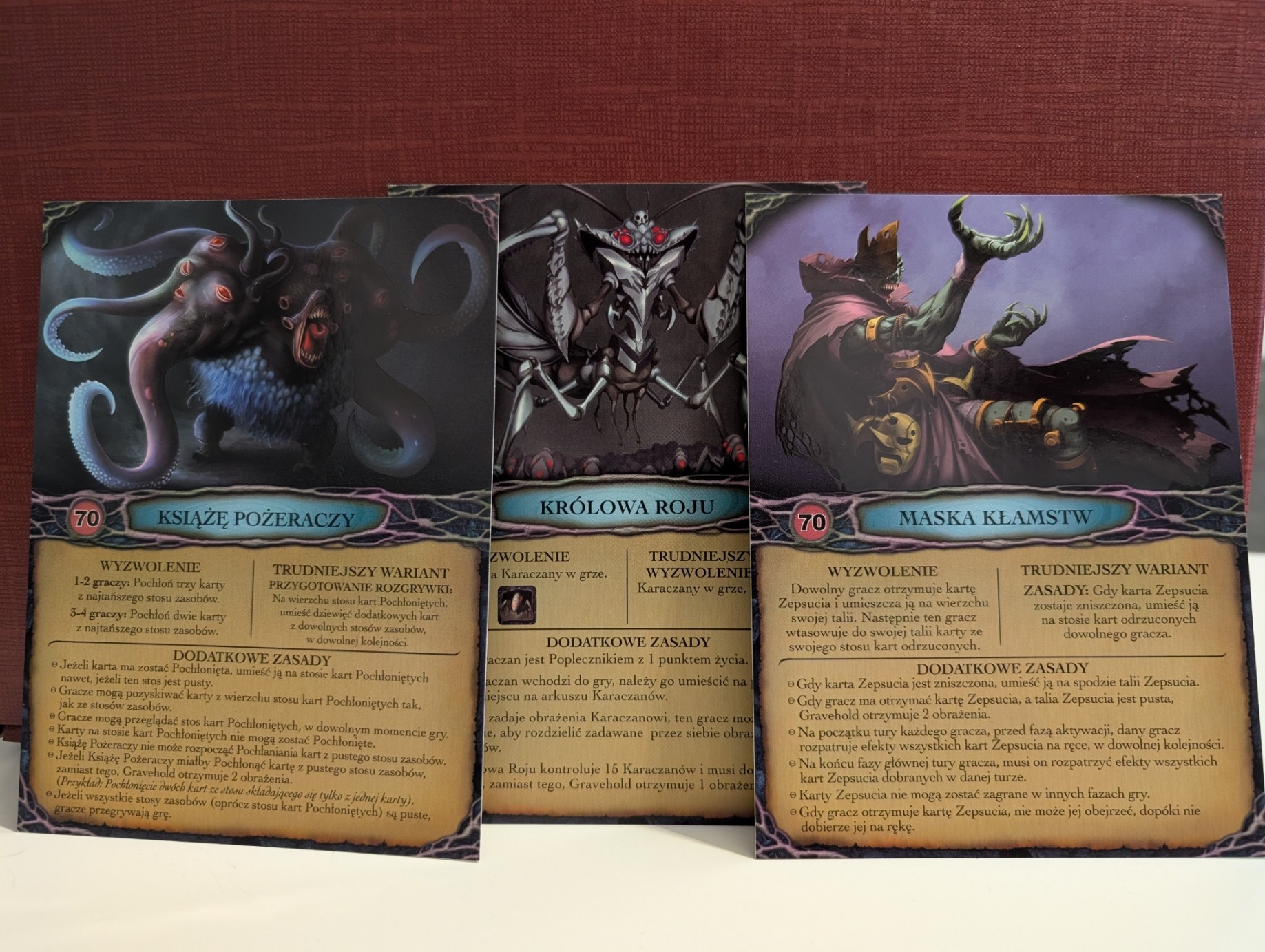 Ciekawym system jest też kolejność tur – tasujemy ze sobą karty i w każdej rundzie kolejność wyjdzie nieco inna. To z kolei utrudnia planowanie, bo nie wiemy czy przed naszą turą nie odbędą się przynajmniej dwie tury potwora. A każda z nich może okazać się katastrofalna w skutkach.