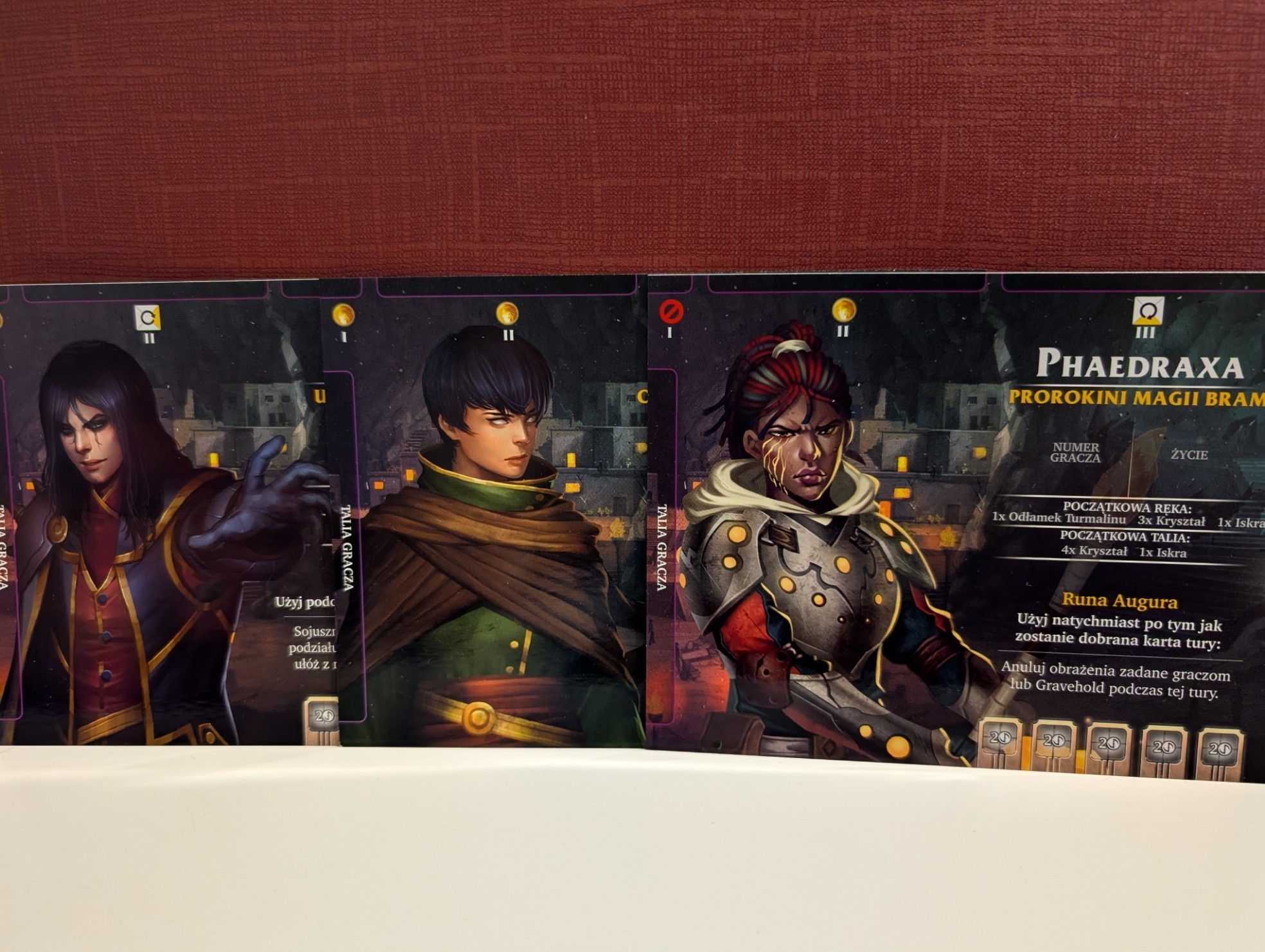 Żeby skompensować narzekanie czymś pozytywnym wspomnę, że gra jest wykonana rewelacyjnie. Producent postawił na materiały premium i karty są rewelacyjne w dotyku. Przypominają mi high-endowe Bicycle do pokera. A planszetki graczy mają nawet foliowane rysunki. Aż szkoda to wszystko koszulkować, poważnie. Nie wiem natomiast po co na kartach klimatyczne cytaty, które może i nie są klimatyczne, ale za to do ich przeczytania potrzebna jest lupa.