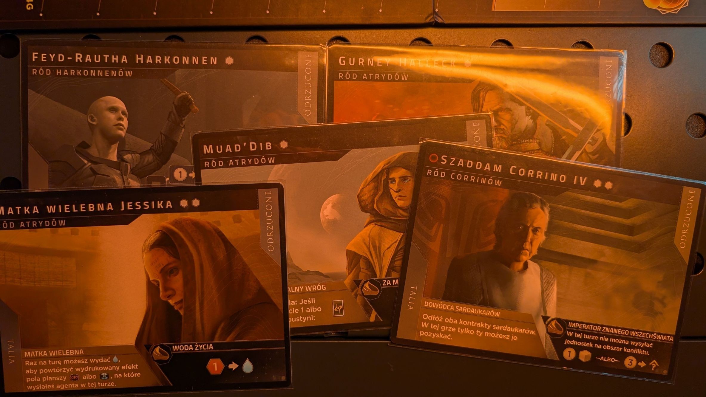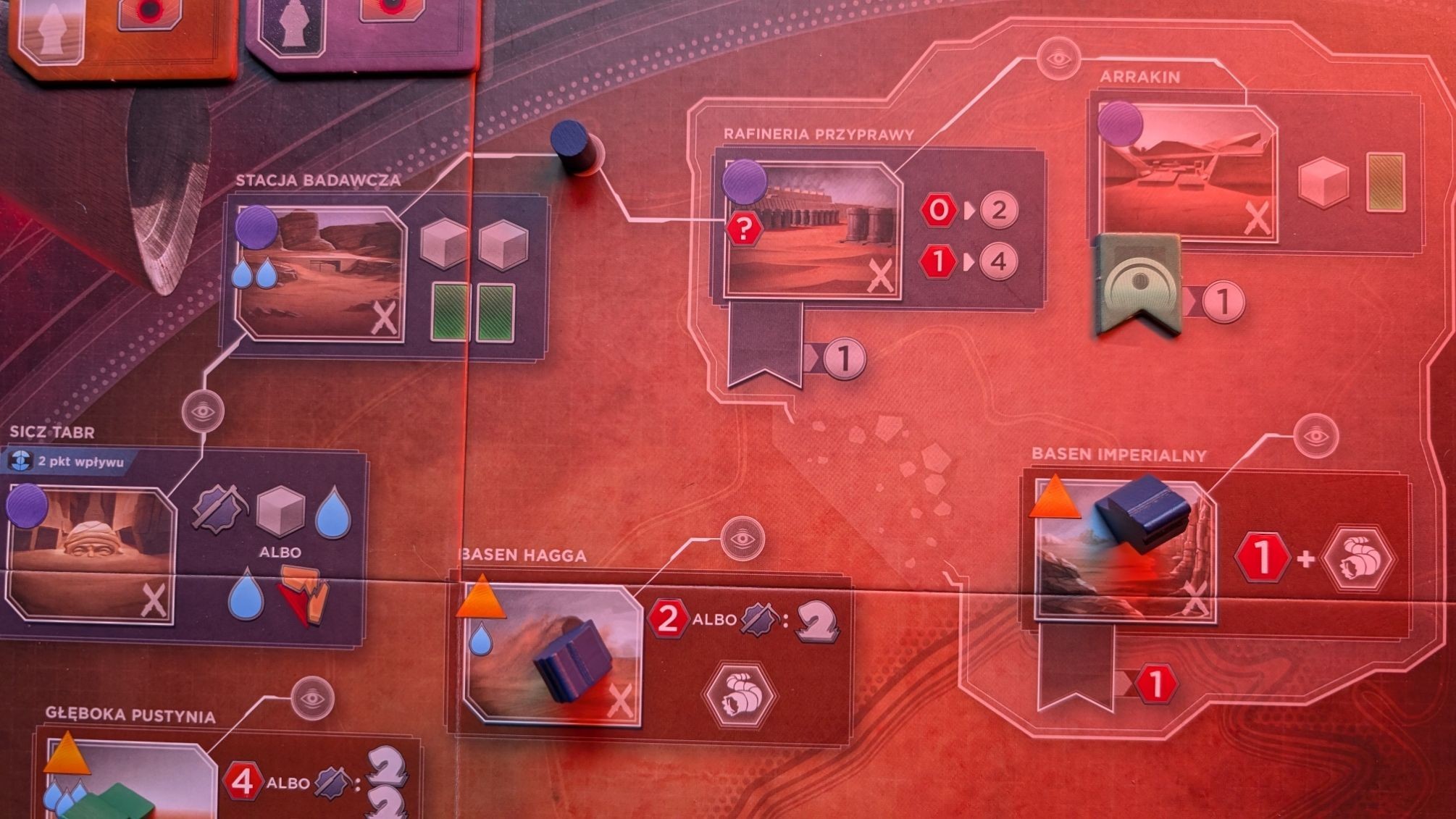 Do tego wszystkiego walczymy o poparcie czterech frakcji – Imperium, Gildii Kosmicznej, Fremenów i Bene Gesserit. Wykonując akcje z ich pól możemy awansować na torach wpływów. W poprzedniej edycji dawało to praktycznie tylko dodatkowe (aczkolwiek bardzo cenne) punkty. Teraz odblokowuje to kilka ważnych pól, co sprawia, że cały wyścig jest nieco dynamiczniejszy.