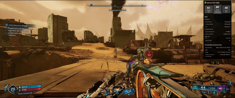Zaczęliśmy od hardkoru, czyli już wspomnianych Borderlandsów 4. Gra pod względem optymalizacji okryła się już złą sławą zarówno wśród posiadaczy pecetów, jak i zwłaszcza konsolowców, gdzie upscaling z rozdzielczości 320p (sic!) jest ponoć normą. Ale i na PC gra nie błyszczy, grywalna stała się dopiero na kompie z RTX 4080 SUPER z DLSS i generowaniem dodatkowych klatek. Jak więc poradził sobie z nią GeForce NOW?