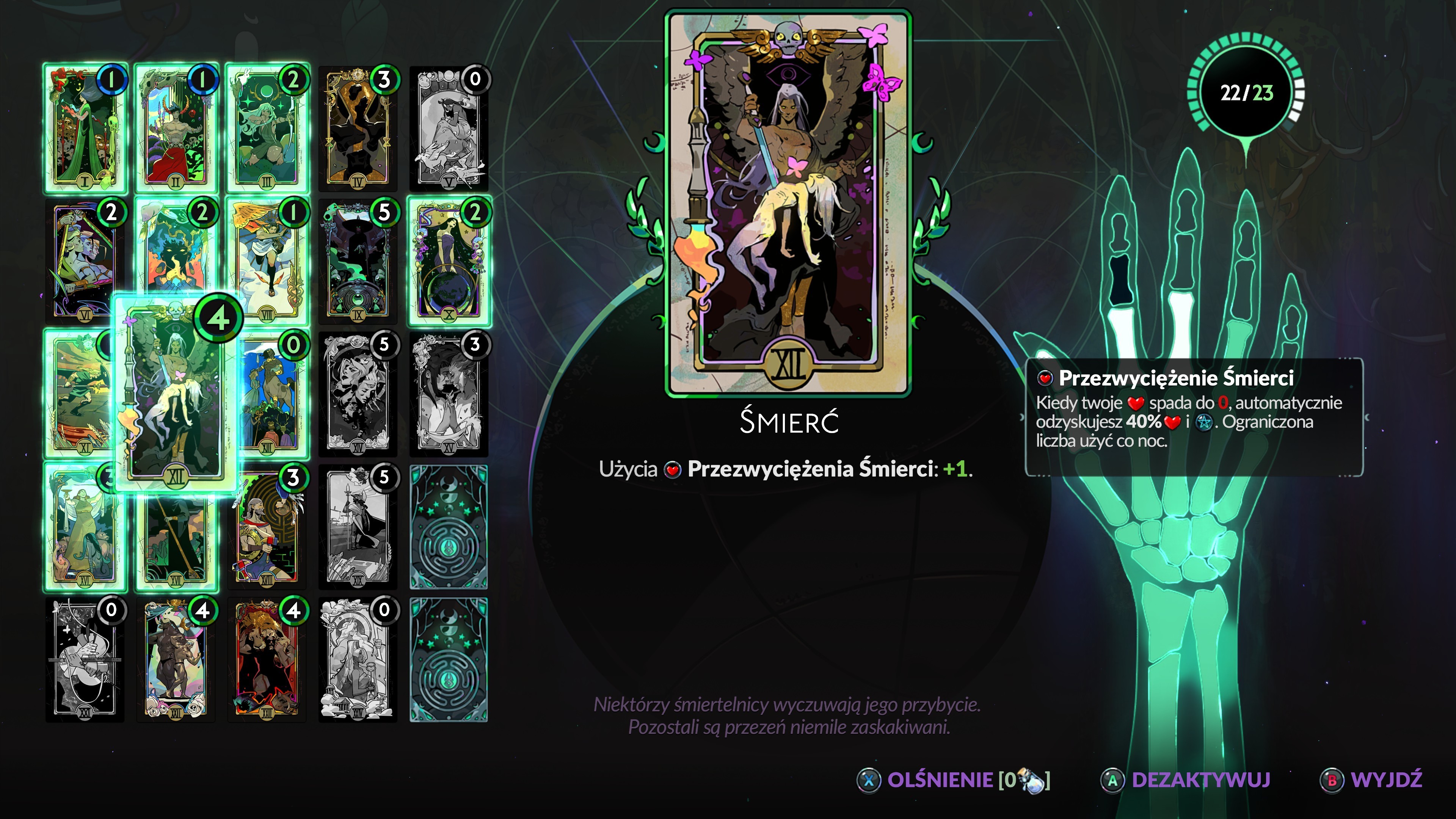 Bardzo podoba mi się, że to że w Hades II autorzy umiejętnie żonglują dostępnymi lokacjami i przeciwnikami. Wrogowie pojawiają się w różnych zestawach i konfiguracjach, Melinoë startuje tylko z kosturem, ale potem zyskuje dostęp do nowych rodzajów broni (np. topora i podwójnych ostrzy). Tak naprawdę nie wiemy, na jakie ulepszenia możemy liczyć po X godzinach zabawy, w związku z czym - na przykład - odblokowanie możliwości korzystania z kart tarota zmienia perspektywę. Podobnie jak to, że na pewnym etapie kampanii mamy więcej niż jedno życie. Mało? To wróćmy do broni, bo pojawiają się tutaj też ich nowe warianty z legendarnymi aspektami, co kompletnie zmienia ich sposób działania.