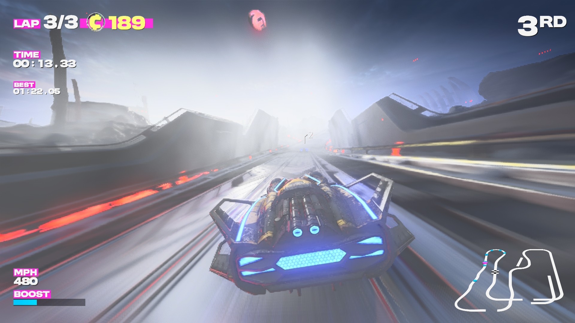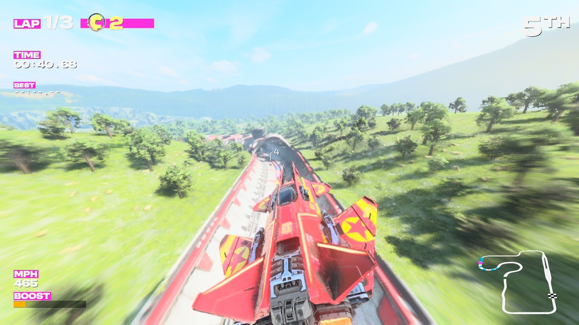 Boost możemy także zyskać zbierając specjalne znaczki na trasie i wykorzystać go albo w celu nagłego przyspieszenia, albo… aby wyeliminować rywala. Gdy uruchamiamy przyspieszenie, wówczas na ten krótki czas, nasz pojazd zyskuje barierę, która potrafi rozwalić naszego przeciwnika. Naturalnie oni mogą robić to samo, więc musimy się mieć na baczności. Tak czy inaczej, jest to kolejne świetne rozwiązanie, które wynosi poziom rywalizacji nieco wyżej i sprawia, że sama zręczność oraz dobre tempo nie wystarczą, więc trzeba wykazać się także odrobiną cwaniactwa. O ile samo ściganie jest bardzo przyjemne, bywa wymagające i jest satysfakcjonujące, tak sztuczna inteligencja na wyższych poziomach trudności zaczyna być irytująca. Nie ważne jak idealnie pojedziemy, boty w magiczny sposób zawsze nas dogonią, a takie sztuczne utrudnianie rozgrywki w wyścigach nie jest według mnie dobrym rozwiązaniem. Jeśli jesteśmy na tyle szybcy żeby odskoczyć swoim rywalom, to powinniśmy być za to nagrodzeni.