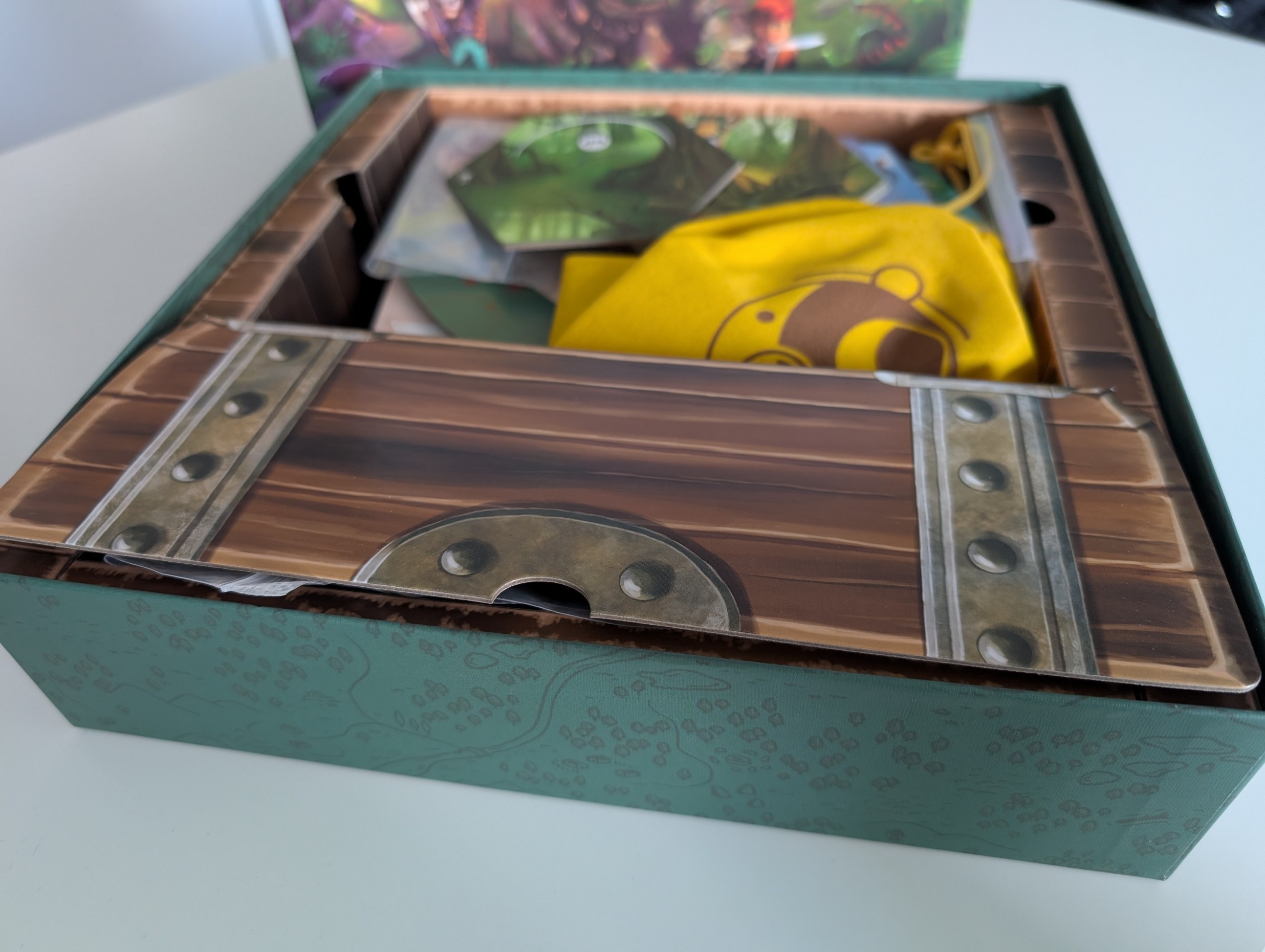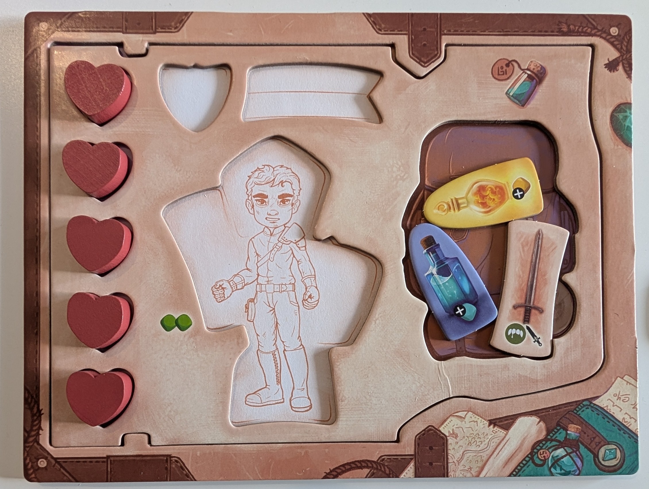 Na wstępie muszę zaznaczyć, że gra jest ładna. Wszystkie komponenty zostały tutaj mocno przemyślane i wyraźnie widać, że efekt wizualny był dla twórców jednym z priorytetów. Fajnie wypada też pudełko, przypominające skrzynię ze skarbami. A absolutną wisienką na torcie są planszetki gracza, które możemy bardzo dowolnie modyfikować. Nasza postać będzie miała imię, możemy narysować jej portret i będzie przenosiła ekwipunek. Tak jak w starych dobrych grach RPG. Mamy też książeczkę z opisem fabularnym wszystkich potworów. Niemniej, w samej grze żadnej fabuły już nie ma.
