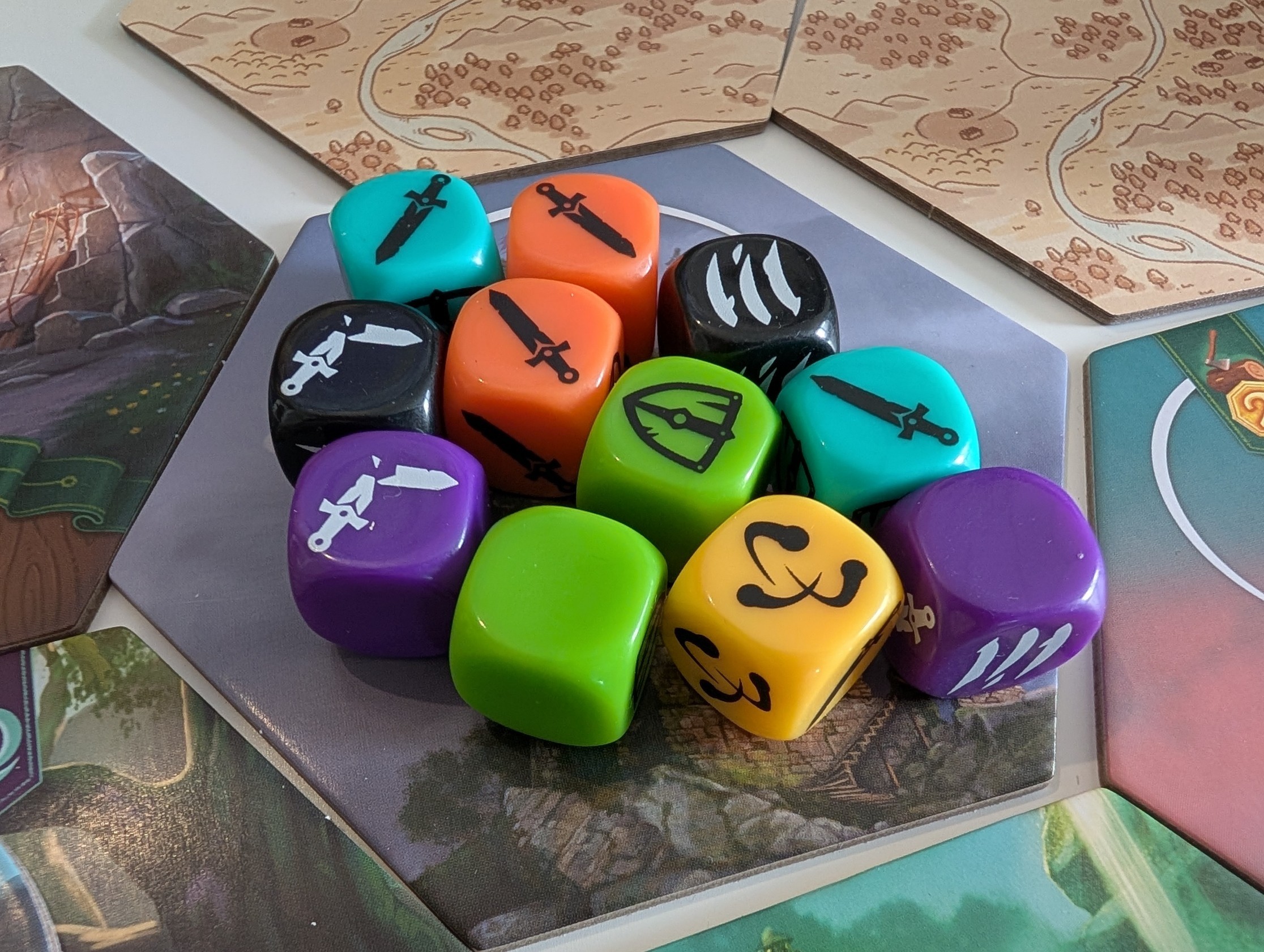 Sednem zabawy są pojedynki z potworami, które zajmują większość całej gry. Walka polega na rzutach kośćmi – zarówno w imieniu bohatera, jak i potwora. Pokonanie przeciwnika wymaga zadania mu ustalonej liczby obrażeń w maksymalnie trzech próbach. Oczywiście potwory potrafią się bronić, a nierzadko także ranią graczy. Po utracie piątego punktu życia bohater zostaje ogłuszony, wraca na zamek i traci wszystkie monety oraz jeden element wyposażenia. Potwory nie różnią się od siebie zbyt mocno, mają po prostu różną ilość punktów życia i różne nagrody (1-2-3 ekwipunki). Z czasem gra staje się więc powtarzalna i raczej monotonna. Dla młodszych graczy to jednak wzorowa nauka szacowania prawdopodobieństwa. I tego, że kości to jednak gra losowa i coś z niską szansą nie oznacza szansy zerowej. Zdarzyło mi się spudłować osiem razy w ośmiu atakach, mając 50% szansy na trafienie w każdym z nich. Matematykę zostawiam wam, ale było to jedno z ciekawszych planszówkowych doświadczeń i długo siedziałem skołowany myśląc jak mogło się to w ogóle stać. Na szczęście, porażki są kosztowne, ale nie aż tak żeby zniechęcać do ryzykownych prób.