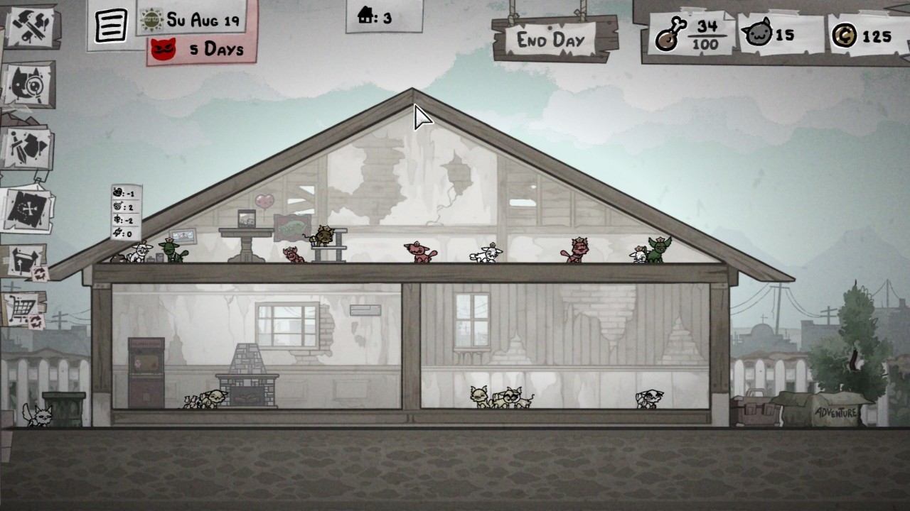 Co jakiś czas pod nasz dom podchodzić będą też bezpańskie koty, które możemy przyjąć lub zignorować. Samo domostwo natomiast da się ulepszyć poprzez dokupowanie do niego wyposażenia, które zwiększa komfort, a więc i pomaga w tworzeniu lepszych potomków. Tworzeniu, podczas którego dochodzi do spółkowania, to zaś ma animację… Cóż, powiedzmy, że Edmund nie zostawia tutaj zbyt wiele dla naszej wyobraźni. Kotów nie możemy jednak stackować w nieskończoność, bo trzeba je karmić. Jedzenie z kolei zdobywamy na misjach i tak to się wszystko kręci. I jeszcze raz, i jeszcze raz – syndrom jeszcze jednej rundy jest tutaj jak najbardziej obecny.