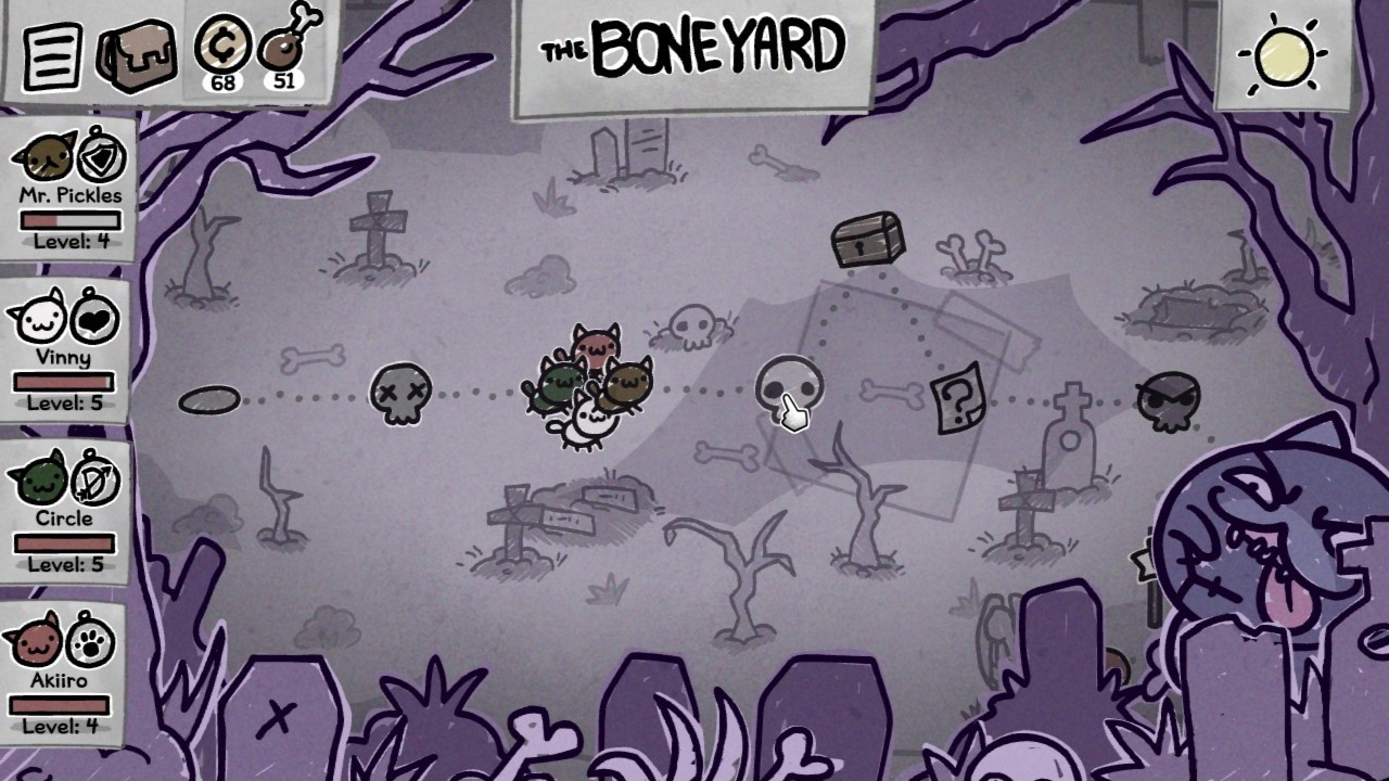 Właśnie, śmierć. Każdą eskapadę rozpoczynamy z maksymalnie czteroma kotami. Te mają różne statystyki, które możemy jeszcze zwiększać poprzez nadawanie im klas. Na początku gry mamy ich tylko kilka, ale wraz z postępami dochodzą kolejne, jak np. nekromanta. Jeżeli podczas jednego ze starć kot zginie, po wygranej bitwie możemy go odzyskać. Chyba że jego ciało zostanie zniszczone – wtedy mruczek przepada bezpowrotnie, a my idziemy w osłabieniu. Te kociaki, którym uda się przetrwać i bezpiecznie wrócić do domu, zyskują status emerytowanych. Na kolejne wojaże już ich nie wyślemy, ale możemy je wykorzystywać do dalszego rozmnażania, by w ten sposób pozyskiwać lepsze jednostki.
