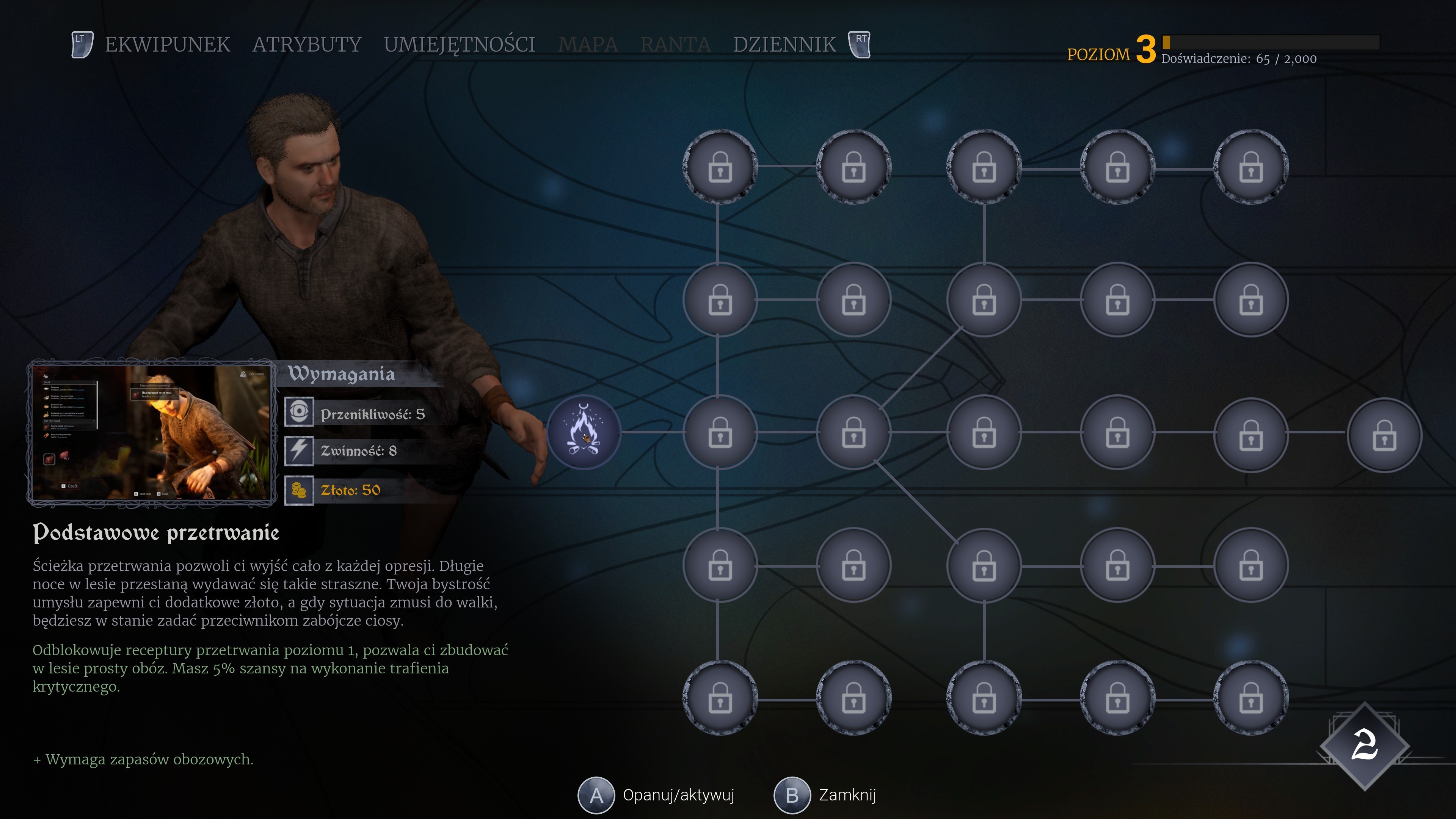 Rozwój postaci w Of Ash and Steel oparty jest o zdobywane punkty doświadczenia. Co ważne, pozyskujemy je zarówno poprzez odkrywanie lokacji, przeprowadzanie dialogów, jak i pokonywanie przeciwników. Poza możliwością levelowania i rozwijania statystyk mamy także trzy drzewka umiejętności związane z przetrwaniem, rzemieślnictwem i walką. Nie jest to jednak prosty system, lecz powiedziałbym, że raczej hardkorowy. Nie dość, że poszczególne zdolności wymagają odpowiednich statystyk i konkretnej liczby złota, to nawet dysponując tym wszystkim musimy jeszcze znaleźć kogoś, kto nas danej czynności nauczy. Na początku wydaje się to irytujące, ale ostatecznie uznałem to za element, który jeszcze bardziej zachęcił mnie do eksploracji.
