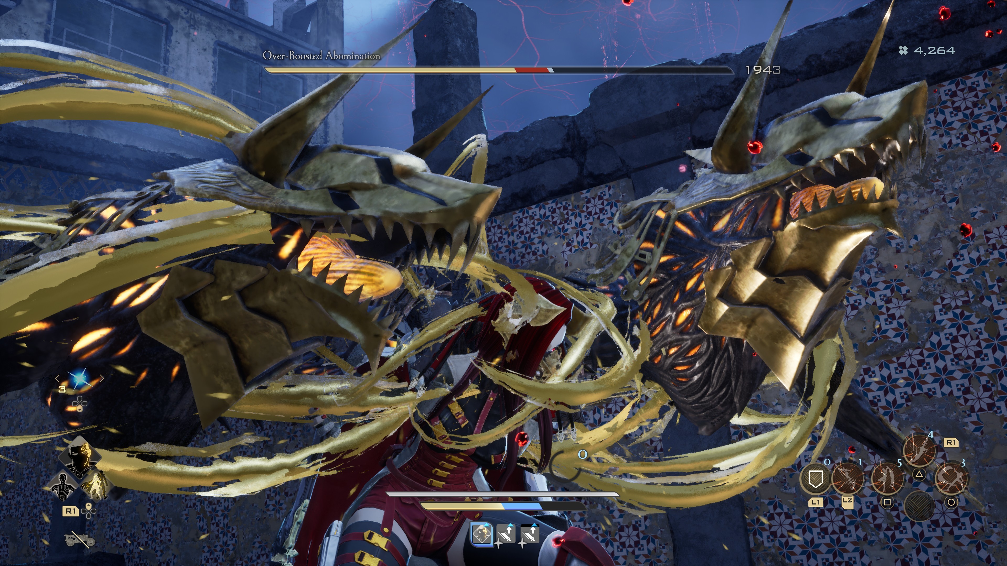 Reszta to tak naprawdę dopasowanie do naszego bohatera odpowiedniej broni (zwykłej lub specjalnej), Formae (broni dodatkowej wspieranej Ichtiorem), Jaili (tym razem oddzielonych od pancerzy, których również jest całkiem sporo do wyboru i stworzonych do zgarniania Ichtioru) oraz umiejętności (które również musimy dopasować pod kątem tego ile mamy wolnego miejsca w poszczególnych atrybutach, aby móc je w ogóle dopisać do wykorzystywanej broni). Do tego jeszcze dorzucamy boostery, które możemy wydobywać z różnych cząstek przeciwników i dopasowywać do naszego buildu... a te mogą nas obciążyć, jeśli wykroczymy poza pewne atrybuty po stronie Blood Codes.