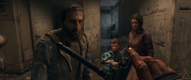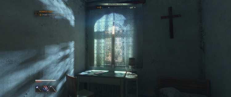Tak przy technikaliach będąc, to jeszcze wytknę parę niedoskonałości. Bo bez glitchy, to się dziś już chyba nie da. Takich najbardziej standardowych, głupiutkich. Tu sobie jeden model wpadnie w drugi i to podczas sceny fabularnej, rujnując totalnie nastrój. Innym razem jakiś zarażony zawiśnie radośnie na ścianie na jednym pikselu czubkiem buta, inny zablokuje w sekwencji przechodzenia przez szparę, przez którą i tak przecież nie przejdzie, a martwemu najemnikowi silnik gry dorobi gustowną podstawkę. Raz przez glitchowego babola nawet zginąłem, ale na szczęście podczas zwykłej eksploracji, a nie misji. No i kiedyś chwytając się okiennicy wpadłem do środka gry, ale po kilku użyciach linki udało się wyrwać z tego limbo. Szkoda też, że nie wykorzystano w pełni ekranu panoramicznego i interfejs nawet na nim ma wciąż proporcje 16:9. Dla odmiany na koniec pochwalę bardzo, ale to bardzo ogarnięty i trzymany w ryzach ragdoll, co przetestowałem wielokrotnie i zuchwale maską pędzącej terenówki. I ani razu nie zobaczyłem ciała lecącego w kosmos. Szacun.