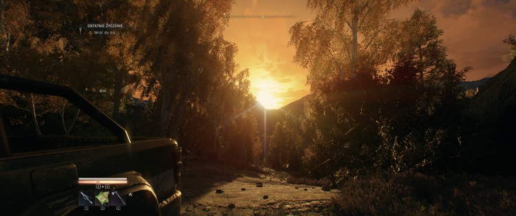 Szkoda tylko, że od razu nie dano nam jakiegoś garażu, czy innej opcji przechowywania ulubionego pojazdu. Może dlatego, że grywalny jest tylko jeden model terenówki? Albo gdzieś tam w planach jest DLC poświęcone pojazdom? Czy też najzwyczajniej postawiono na prostotę, bo czas gonił, a po ambitnych planach zostały ślady w postaci interakcji “napraw samochód”, choć w grze nie odnalazłem żadnych zestawów naprawczych? Nie wiem, pewnie czas pokaże i oby za darmo.