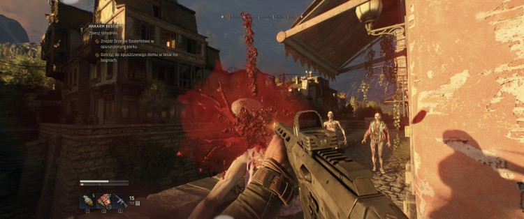 Strzelanie samo w sobie jest chyba najlepsze z dotychczasowych gier, czuje się dobrze te giwery, a obsługa jest płynna. One nawet wrażenie odrzutu mają całkiem realistyczne, choć pewnie nie powinno być żadnego, wszak trzyma je w łapskach Kyle Crane. Jakoś najmniej podobał mi się karabin wyborowy, który zresztą ma w grze najmniejszą chyba przydatność zaraz po pistolecie maszynowym. Jak zawsze karty rozdaje strzelba, przydatna także podczas kilku potyczek z niektórymi bossami. Najbardziej chyba brakowało mi w tym wszystkim jakiegoś wygodnego sposobu przełączania broni. O ile walcząc wręcz zazwyczaj używamy cały czas tego samego, najmocniejszego majchra, o tyle giwery zmieniamy relatywnie często, a jedyna dostępna opcja to sekwencyjne przełączanie tym samym klawiszem. Kilka razy niemal mnie to zabiło. To wciąż zło. No i jeszcze spory babol z granatnikiem, do którego nie dawało się załadować innej amunicji, niż podstawowa, choć mogłem wyprodukować kilka rodzajów.
