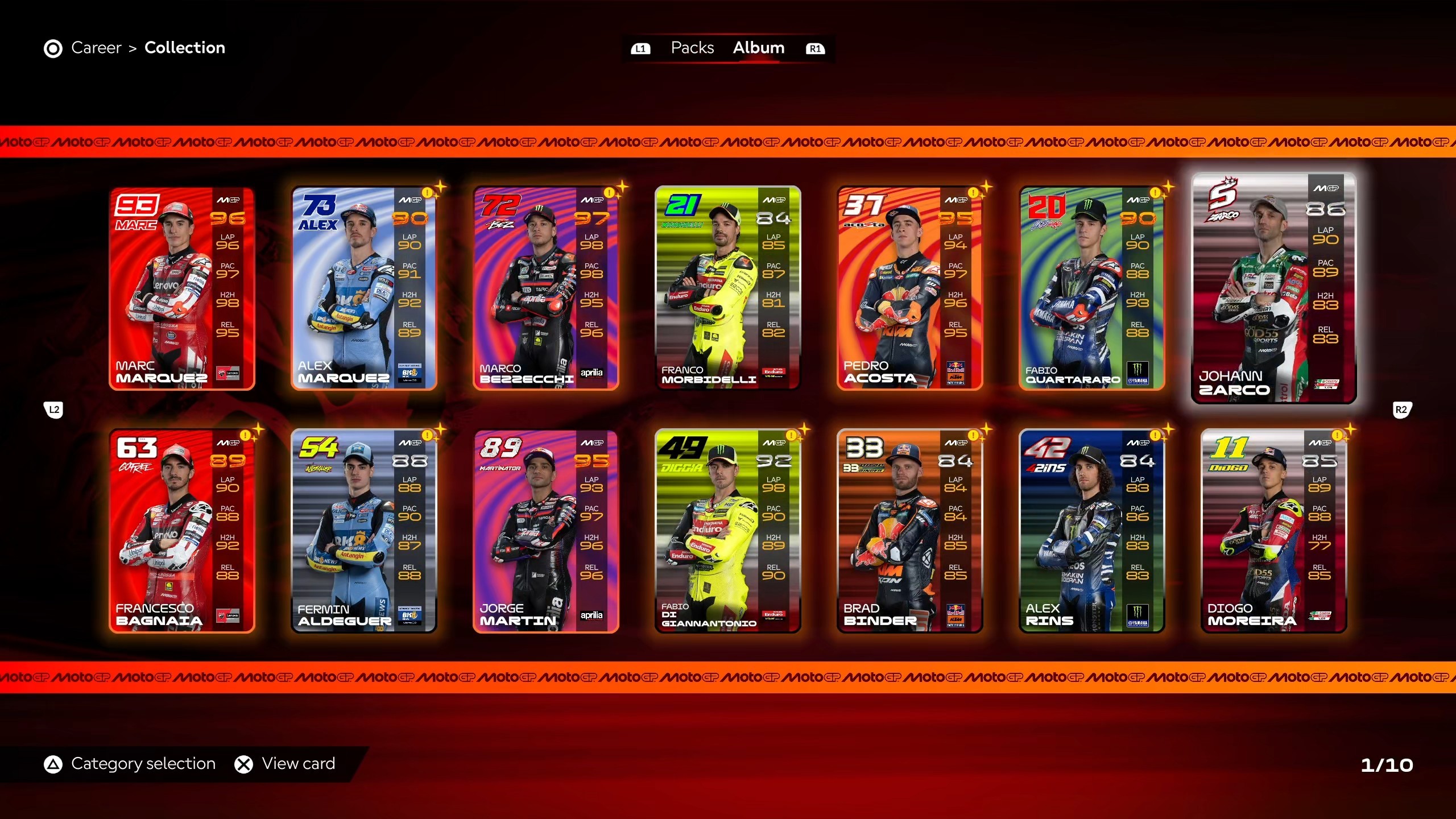 Ostatnią nowością w trybie kariery jest… kolekcjonowanie kart z zawodnikami i torami. Na początku pomyślałem, że jest to niesamowicie zbędny element, ale z czasem wciągnąłem się w otwieranie kolejnych paczek i uzupełnianie kolekcji. Tak pewnie, jest na to jakieś określenie w psychologii, ale wydropienie jakiejś złotej karty z ulubionym motocyklistą w dwudziestej paczce daje sporo radości. Choć była to fajna dodatkowa zabawa, to myślę, że potencjał nie został w pełni wykorzystany, być może ze względów licencyjnych. Taka aktywność aż prosi się o karty z legendami. Kto by nie chciał wydropić Valentino Rossiego, Jorge Lorenzo, Giacomo Agostiniego, Micka Doohana czy innego Shinyę Nakano? Milestone, jeśli to czytacie to już wiecie co robić za rok. Generalnie karty jako dodatek sprawdzają się fajnie. W ogóle nie są inwazyjne, nie trzeba się na nich skupiać, a po zakończonej zabawie ze ściganiem można sobie zapewnić odrobinkę radości z otwierania paczek – czysto kolekcjonersko.