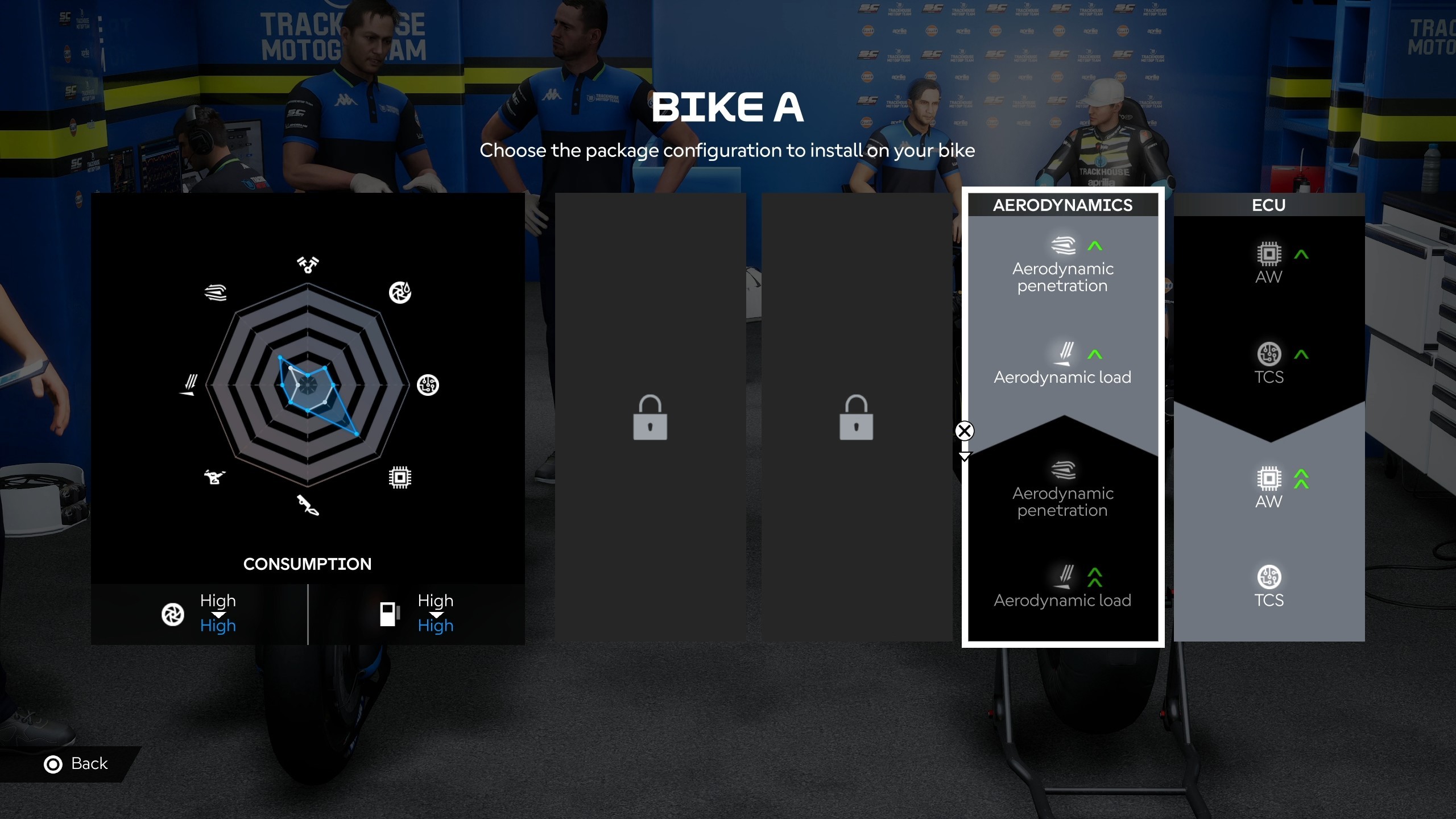Dewelopment motocykla wygląda tak samo jak wcześniej, a wiec rozwijamy sprzęt za pomocą rozmowy z inżynierem. Opisujemy problem, a następnie prosimy o rozwój w konkretnym kierunku i to również bardzo fajnie się sprawdza. Gdy po dwóch rozmowach poprosiłem o poprawę kontroli trakcji, ponieważ tylne koło na wyjściach z zakrętu traciło przyczepność, zespół wprowadził zmiany i poprawa była wyraźna, także ta mechanika zdaje się działać jak należy. Poprawiono także interfejs ustawień motocykla, który był niezwykle niewygodny w poprzedniej odsłonie, za co duży plus. Teraz mamy prostą listę poszczególnych elementów maszyny do konfiguracji, co znacząco usprawnia poruszanie się po dostępnych opcjach.