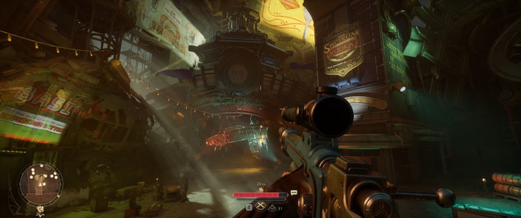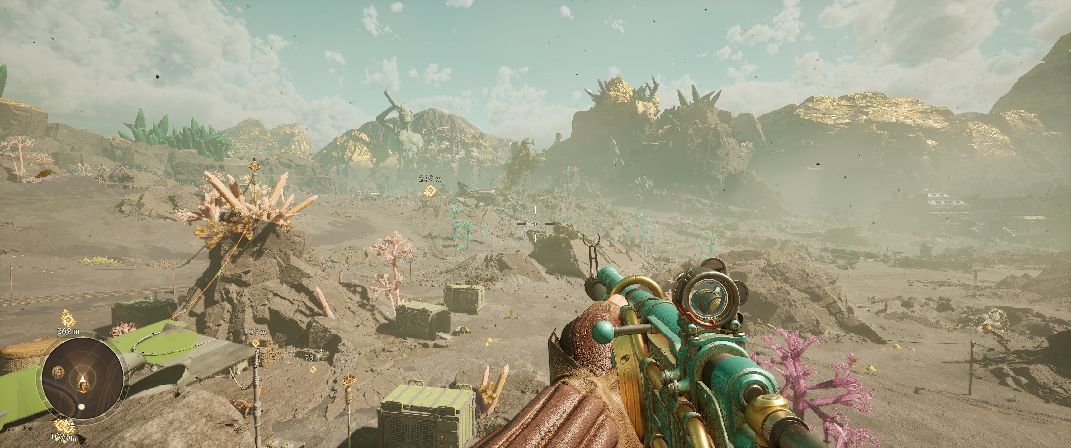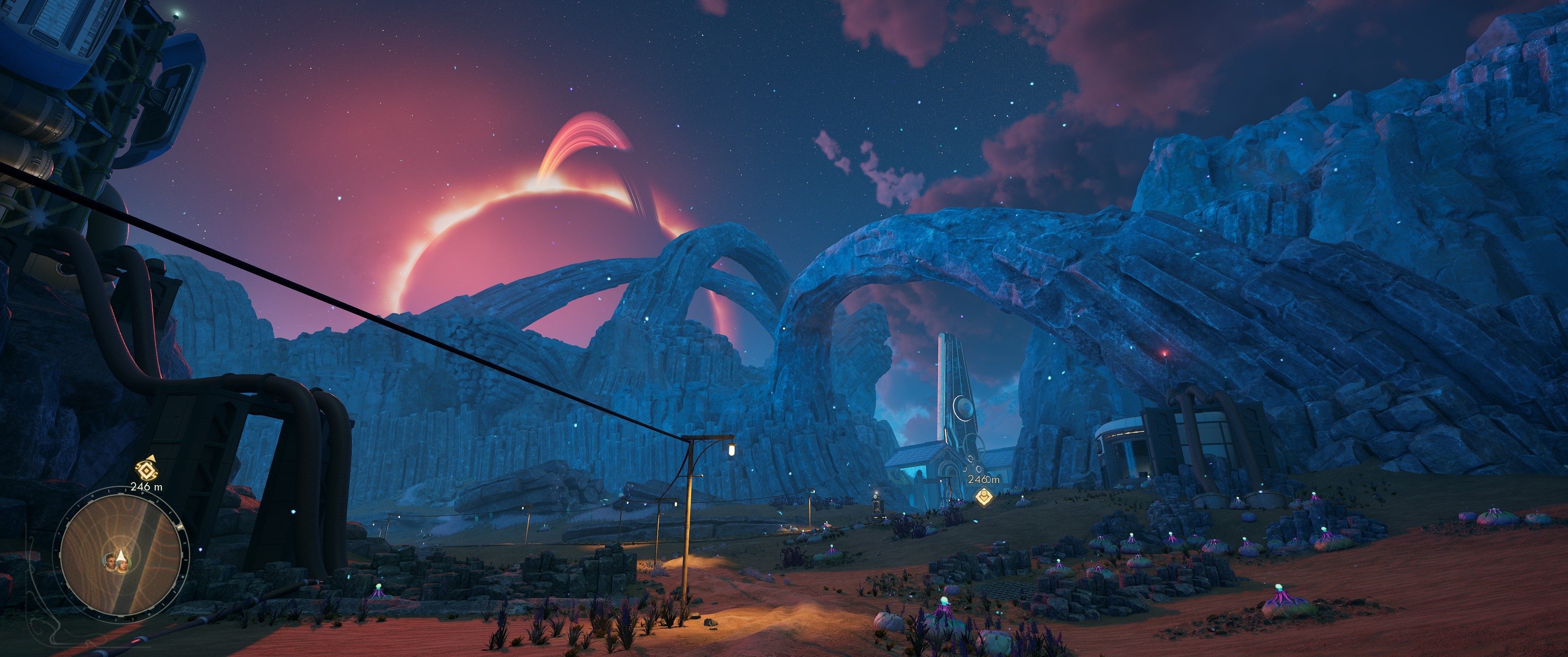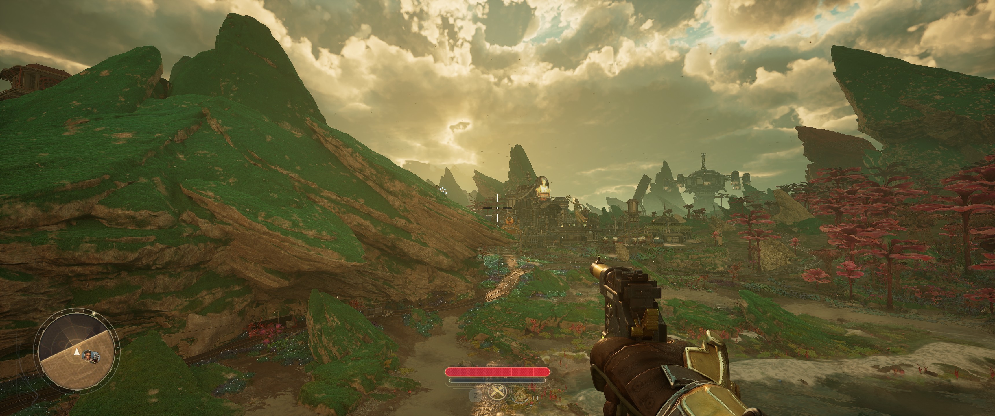 Pochwalić muszę projekty map, zwłaszcza planet z biomami z obowiązkowej listy: zimno, ciepło, parno. Nie są to obszary wielkie, ale w zupełności wystarczają dając satysfakcję z eksploracji oraz odkrywania, a relatywna kompaktowość i system szybkiej podróży pozwalają zachować dobre tempo opowieści, która gra tutaj pierwsze skrzypce. Jest odpowiedni klimacik, jest kiedy trzeba nawet rozmach, jest jednak przede wszystkim komiksowo gęsto. Wokół nas i na niebie też. The Outer Worlds, to gra, która bardzo mocno bawi się swoją konwencją w każdym aspekcie i robi to moim zdaniem równie dobrze, co choćby Pentiment. Najbardziej widocznym tego elementem, poza przerysowaniami fabularnymi, jest oczywiście charakterystyczny design. To rozbuchane kolorami, komiksowe art deco pokochałem niemal od początku. Nie ze wszystkimi decyzjami artystycznymi zgadzam się w pełni, ale jednak uwielbiam całokształt i konsekwencję.
