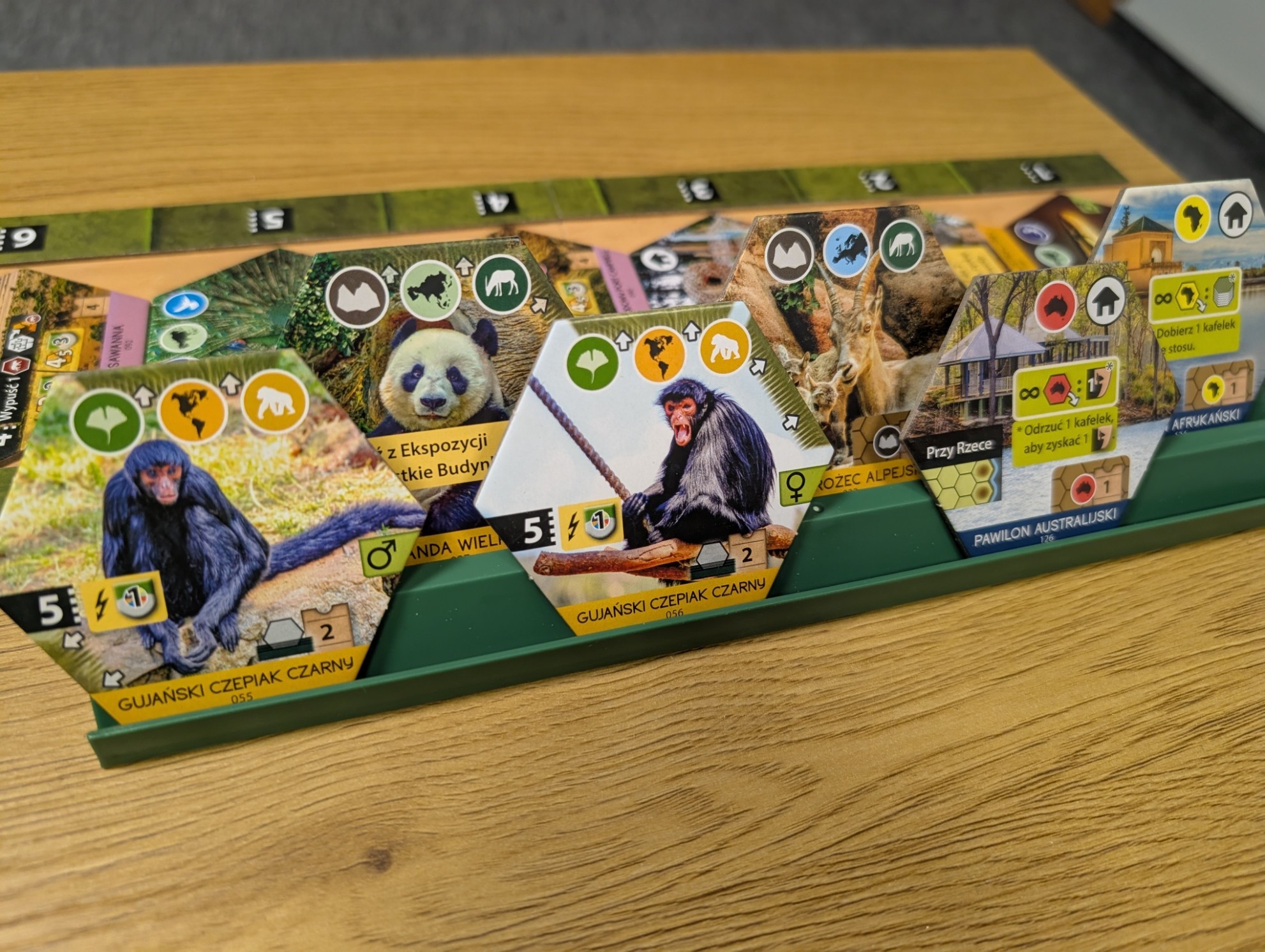 Mechanicznie Rezerwat opiera się na heksagonalnych płytkach, które będziemy stawiać na naszej osobistej planszy zoo. Każdą turę zaczynamy od pobrania płytki, a kończymy najczęściej jej postawieniem na mapie. O tym, co i jak możemy zrobić, decydują cztery płytki akcji umieszczone na poziomach od jednego do czterech. Po zagraniu dana akcja ląduje na jedynce, przesuwając pozostałe trzy do przodu i zwiększając ich moc. Mechanika doskonale znana z Ark Nova, ale mocno uproszczona.