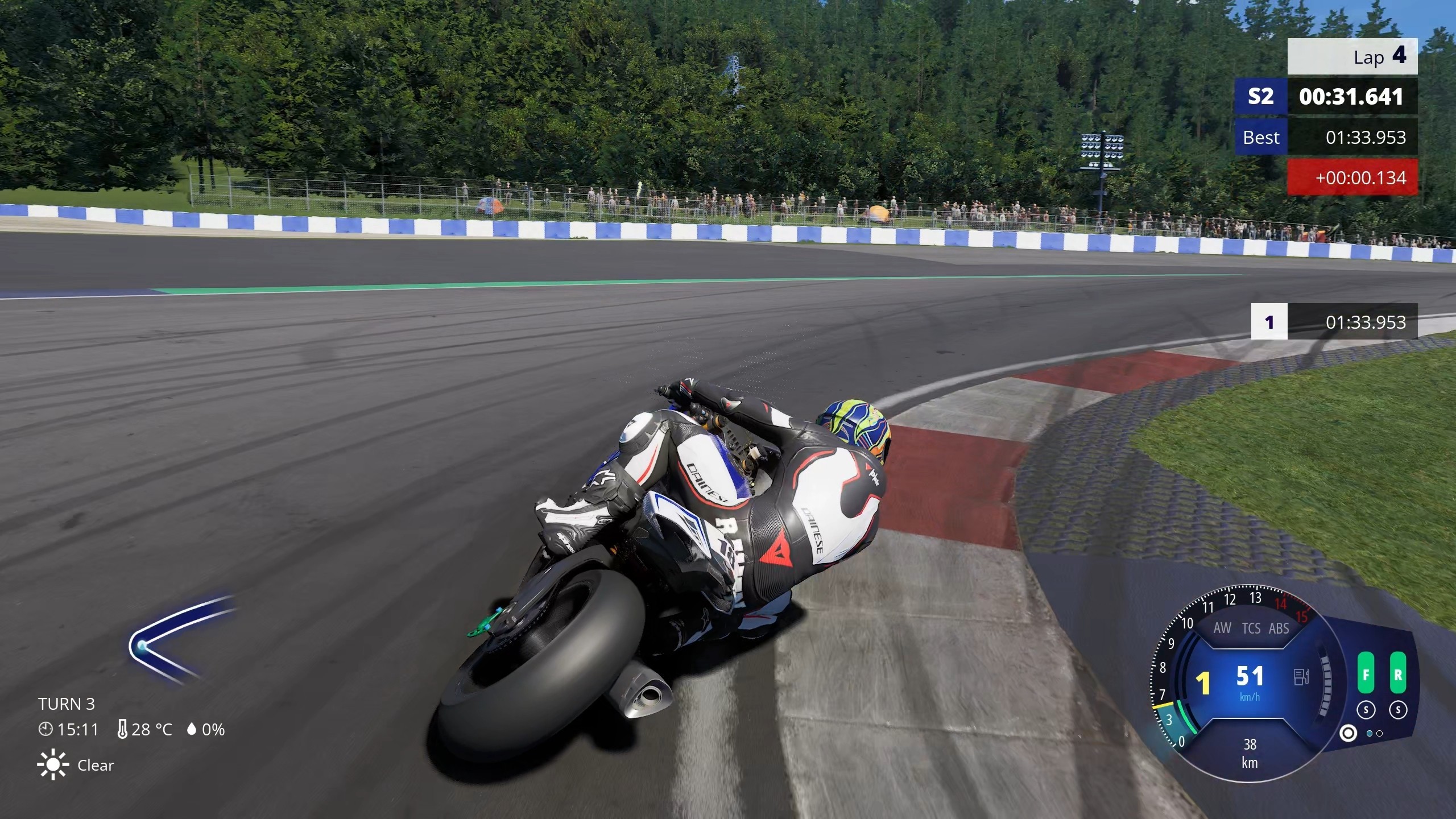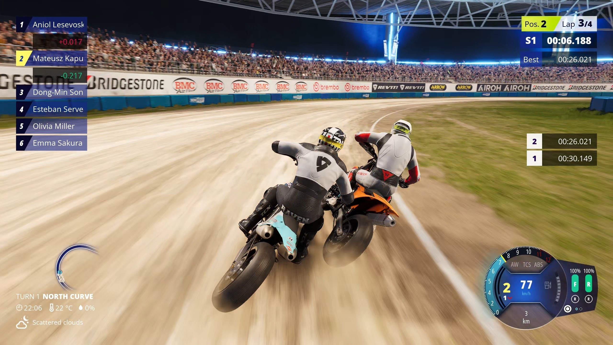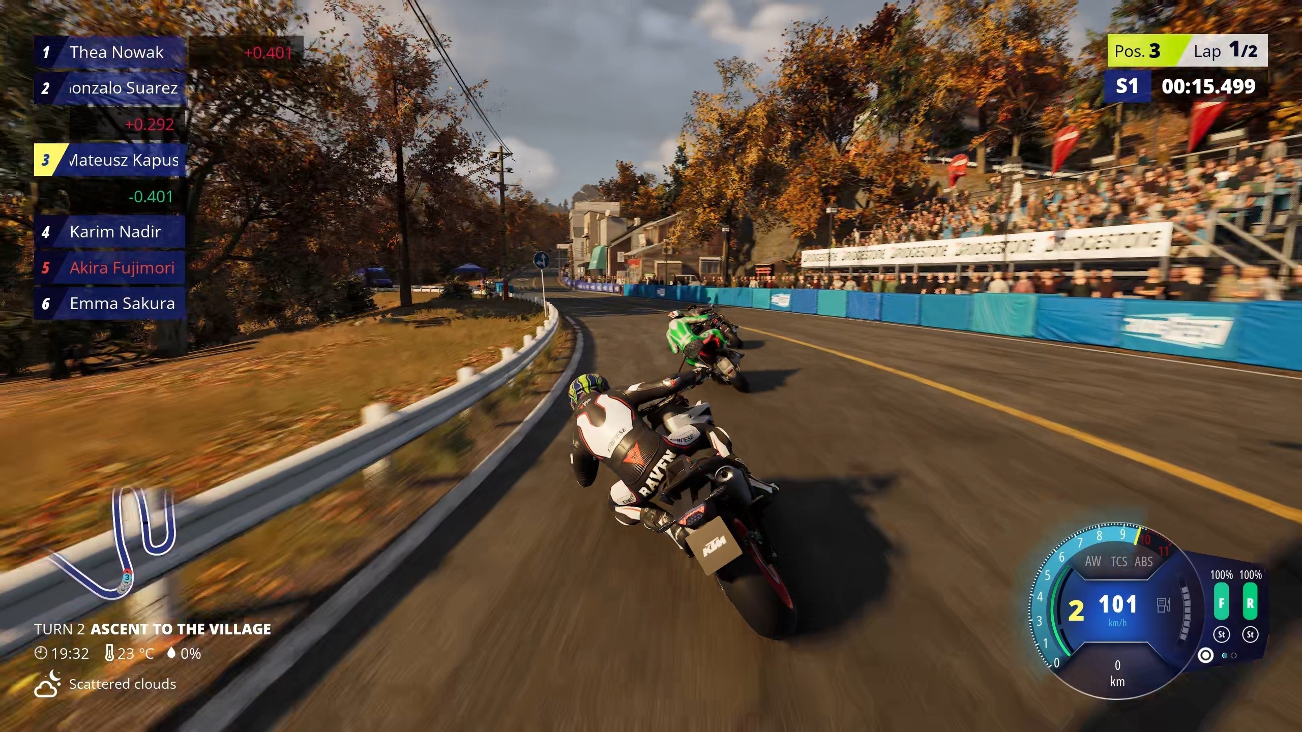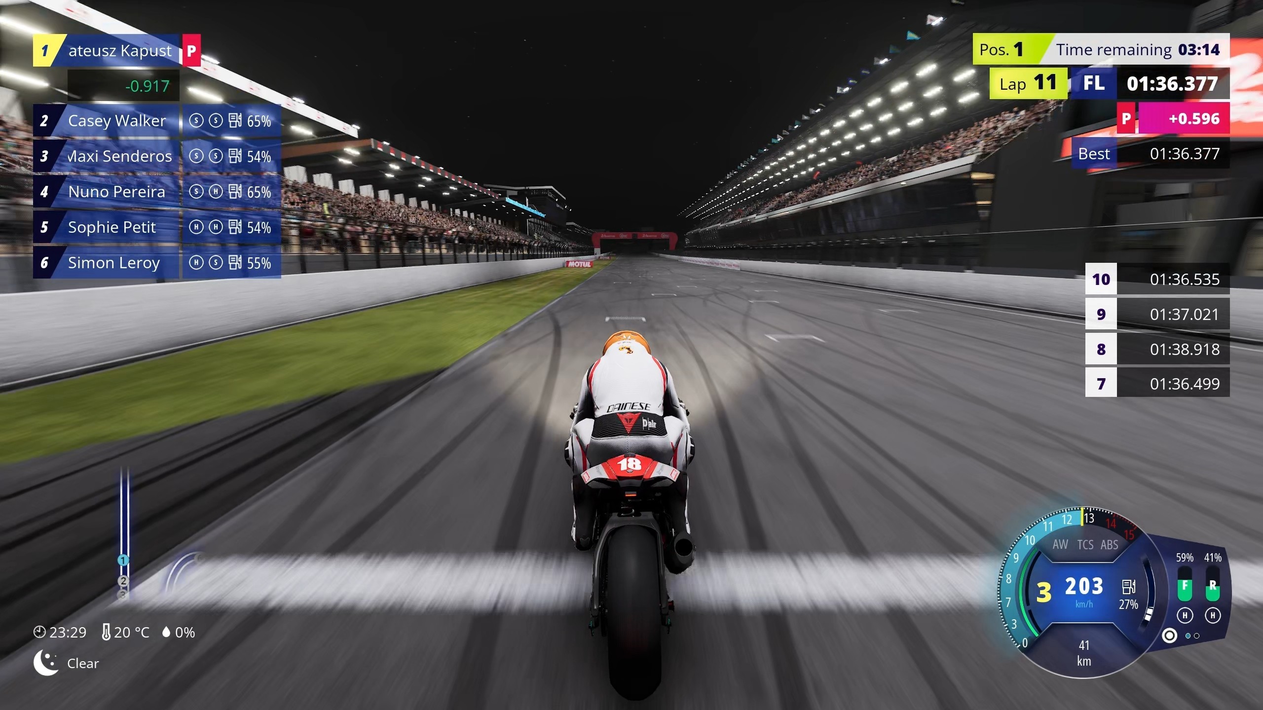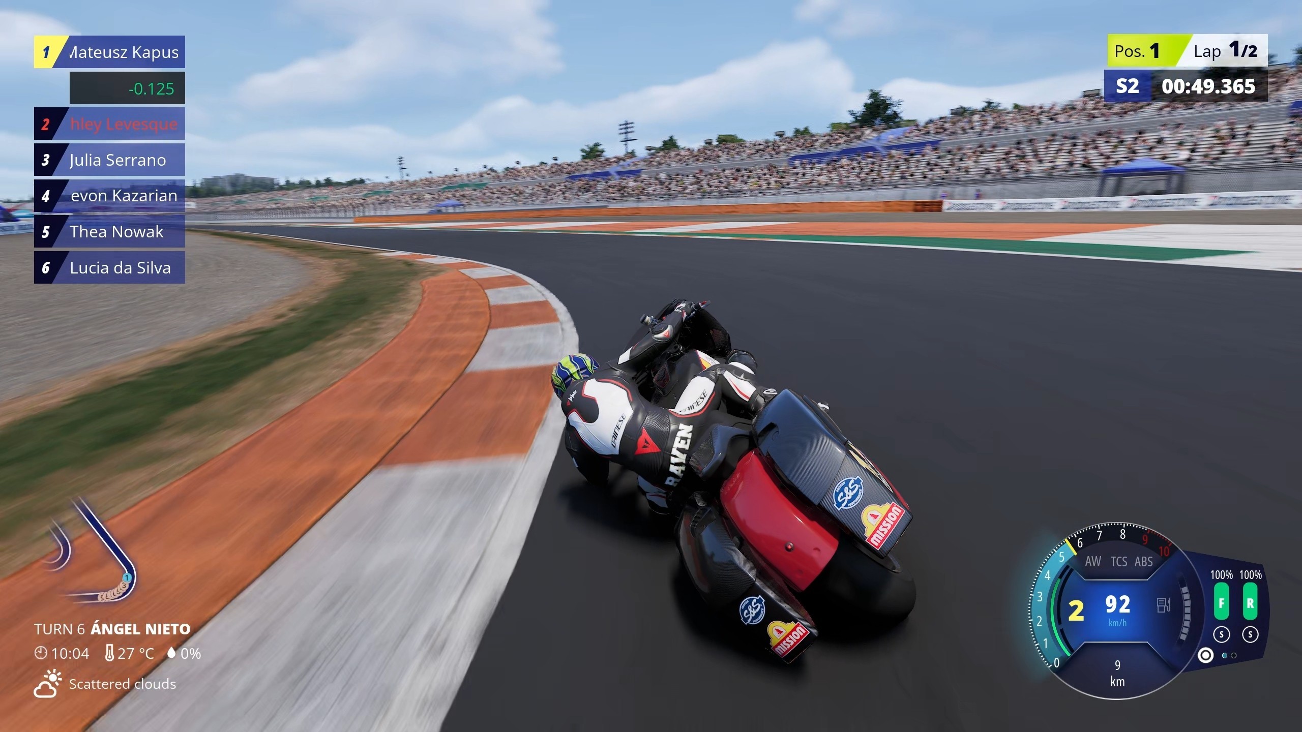 Grając z botami, zauważyłem, że zaskakująco wielu naszych przeciwników to kobiety. Spokojnie, nie mam nic do kobiet, fajnie, że jest ich więcej, zwłaszcza, że nawet w naszym kraju świetnie rozwijają się choćby Patrycja Sowa i Karolina Danak. Zmierzam tylko do tego, że miłym akcentem jest to, iż jedną z rywalek AI jest polska motocyklistka. Co prawda ma dziwaczne imię Thea, ale za to nazwisko tak polskie jak się tylko dało – Nowak. To w sumie nie ma znaczenia, ale rzadko kiedy w takich grach są boty-rodacy więc zwyczajnie wywołało to u mnie małą radość. Generalnie AI na wyższym poziomie radzi sobie sprawnie w walce z graczem, nie miałem z nimi problemów, ale za to standardowo – co jest niemal znakiem rozpoznawczym Milestone’u – sztuczna inteligencja ma kosmiczne tempo w kwalifikacjach, by za moment w wyścigu dać nam się objechać z palcem w nosie. To sprawiało, że jak się tylko dało to olewałem czasówki i startowałem z ostatniego pola, wiedząc że zabawa w kwalifikacje nie ma zwyczajnie sensu. W tym miejscu mogę też pochwalić bossów w postaci legendarnych prawdziwych zawodników. Ci mają znacznie lepsze tempo aniżeli zwykłe boty i pokonanie ich potrafi być sporym wyzwaniem. W walce z tuzami wyścigów nie ma miejsca na błędy i trzeba wykazać się sprytem, dobrą linią przejazdu oraz stale wysoką prędkością. Naturalnie na wyższym poziomie trudności, tak od 80-90 procent w górę. Na łatwym zdążymy zrobić sobie kanapki, zanim boty dojadą do połowy okrążenia.