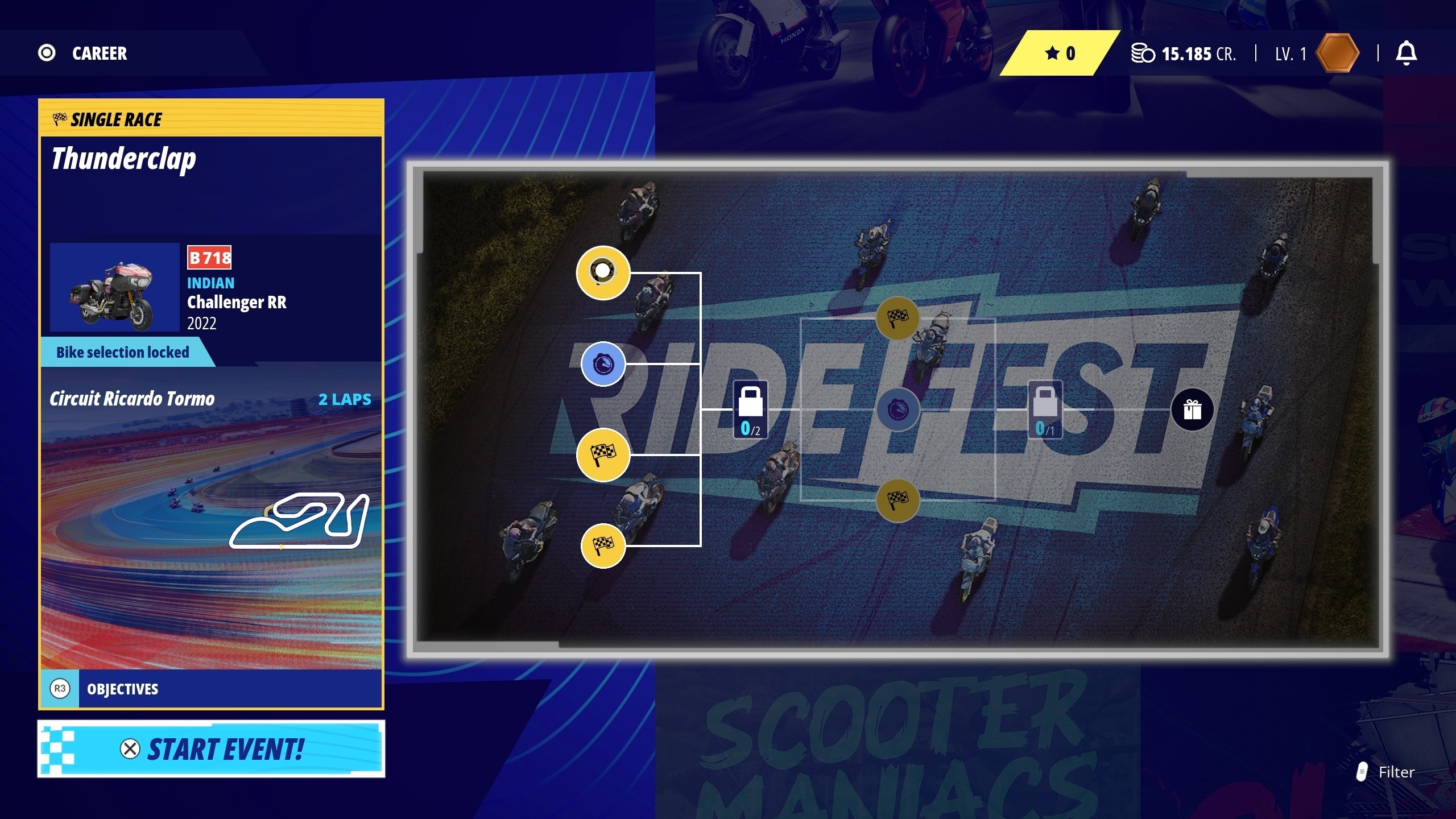 Przed premierą zapowiadano, że w trybie kariery będziemy mieli znacznie więcej swobody i sami będziemy mogli podejmować decyzję w jakich zawodach weźmiemy udział. Przyznaję, faktycznie tak jest. Niestety szybko okazuje się, że ta swoboda i własne decyzje prowadzenia kariery są złudne. Dlaczego? Otóż w Ride 6 musimy zbierać gwiazdki, aby odblokować kolejne kafelki z wyzwaniami. Jeśli odrzucimy jakieś wyścigi, przejedziemy tylko te, które nas interesowały i nawet tym samym ukończymy jakiś kafelek, to okaże się, że brakuje nam gwiazdek, aby przejść dalej. Co to oznacza? Oczywiście znaczy to tyle, że i tak musimy wrócić do wyścigów, które odrzuciliśmy, ponieważ trzeba grindować gwiazdki. Tak więc niby swoboda jest, a i tak trzeba robić większość tego czego być może nie chcieliśmy, aby odblokować więcej zawodów. Przyznajcie, że coś tu poszło nie tak. Przy okazji polecam zrobić tutoriale z Riding School, ponieważ można za ich wykonanie zgarnąć fajne nagrody.