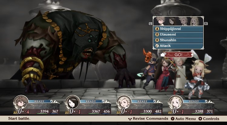 Bravely Default: Flying Fairy HD Remaster stoi na fundamencie klasycznej turówki, w której raz po raz wybieramy komendy dla swoich postaci (atak, magia, przedmiot, umiejętność) i czekamy na odpowiedź przeciwnika. Rewolucją wprowadzoną w oryginalnej wersji 13 lat temu był system Brave/Default. Polega on na strategii z wykorzystaniem modelu ofensywnego (Brave) i defensywnego (Default). W tym pierwszym wariancie możemy wybrać do czterech akcji w jednej turze – jest to potężne działanie, ale ryzykowne, bo jeśli przykładowo cztery ataki lub łańcuch zaklęć nie pokona wroga, to nasz śmiałek może zostać wyłączony z działania na kilka kolejnych tur. Z kolei postawa obronna sprawia, że wojownik przyjmuje mniejsze obrażenia, a jednocześnie zgarnia Brave Points (BP), które to punkty wydajemy na akcje Brave.