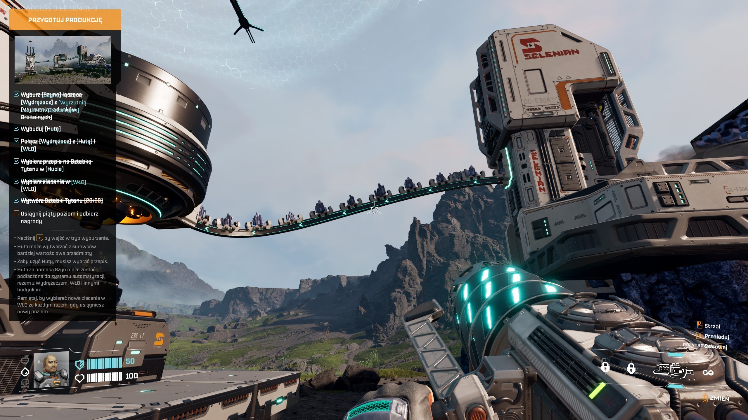 Na początku dysponujemy jedynie Harvesterem (gra jest dostępna w polskiej wersji, ale nazwa narzędzia nie została oficjalnie przetłumaczona) służącym do wydobywania rozmaitych surowców, w tym przede wszystkim rudy tytanu i wolframu, choć tak naprawdę ręcznym pozyskiwaniem zasobów zajmujemy się przez dłuższą chwilę. StarRupture, podobnie jak inne gry tego typu, opiera się bowiem na automatyzacji, dzięki której zdołamy się utrzymać przy życiu (tym bardziej że z czasem odblokowujemy broń palną i możliwość wytwarzania amunicji). Stawiamy więc rdzeń bazy, wydrążacz złóż, wyrzutnię ładunków orbitalnych oraz hutę, łącząc poszczególne budynki ze sobą szynami, dzięki czemu możemy skupić się na kolejnych zadaniach.