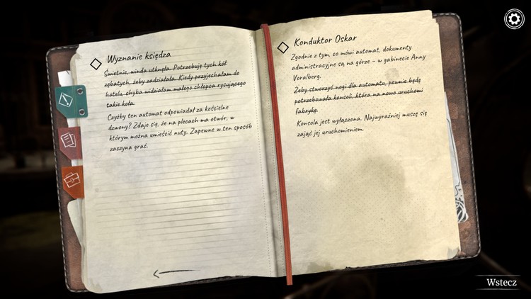 Skoro już o tym mowa, warto zaznaczyć, że Syberia Remastered wyciąga pomocną dłoń w kierunku tych, którzy chcieliby poznać tę świetną historię, a nie wychowali się na przygodówkach. Dlatego też w ustawieniach gry znajdziemy dwa poziomy trudności do wyboru. Choć przygoda od fabuły nie różnią się w znaczący sposób pod względem samej rozgrywki, w tym drugim dziennik zawierać będzie dodatkową zakładkę z regularnie aktualizowaną listą celów misji do zrealizowania. Opisy poszczególnych zadań oferują wskazówki na temat tego, czym powinniśmy zająć się w dalszej kolejności. Ponadto odwiedzając daną lokację na ekranie dowiemy się, że znajdujemy się w jego obrębie. Nie jest to więc prowadzenie za rączkę, ale ciekawy sposób na to, by zachęcić nowicjuszy do dalszej zabawy. Choć z odkryciem kolejnych niuansów fabularnych, znalezieniem przedmiotów i rozwiązaniem kolejnych zagadek wciąż będą musieli poradzić oni sobie sami.