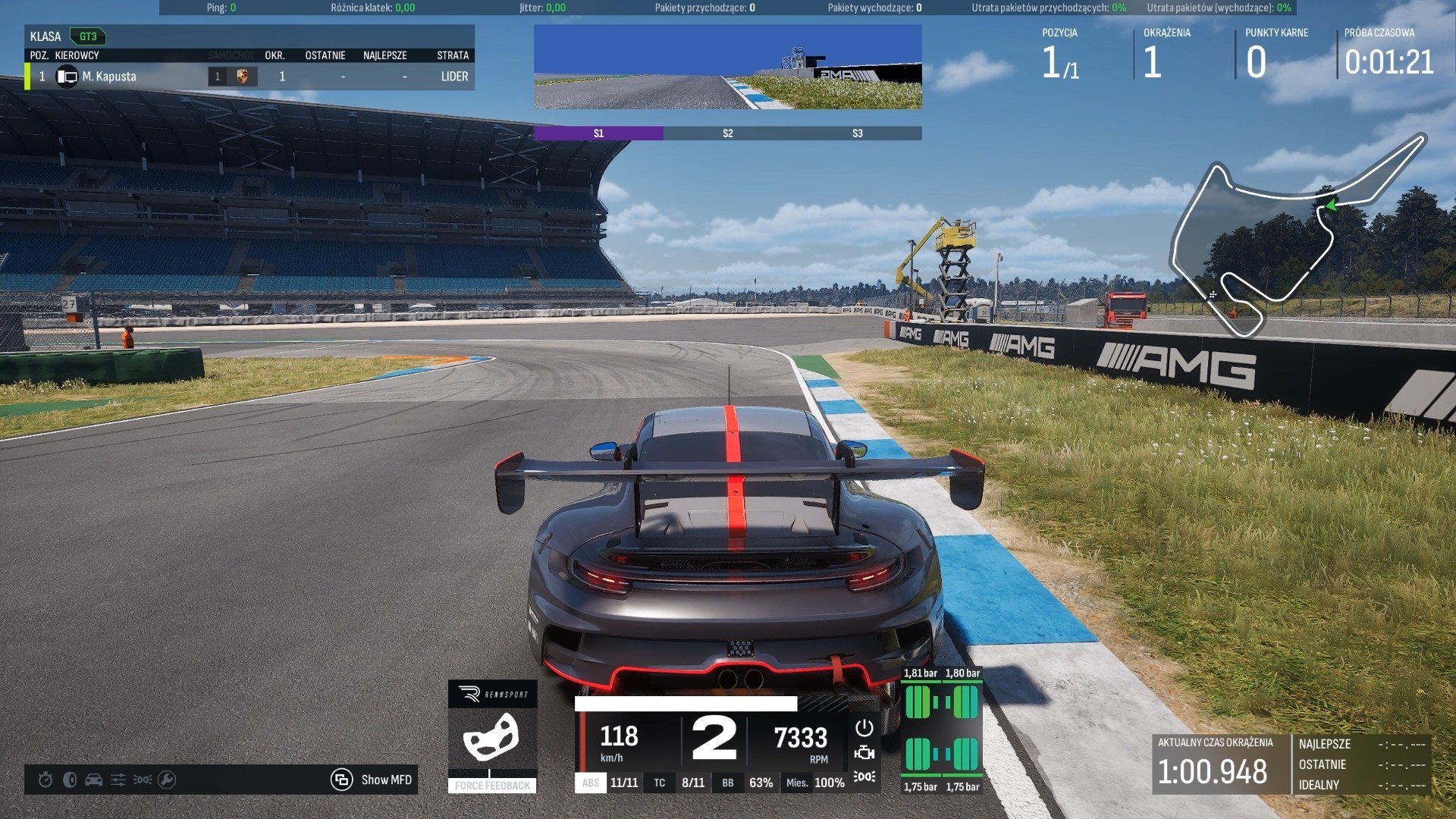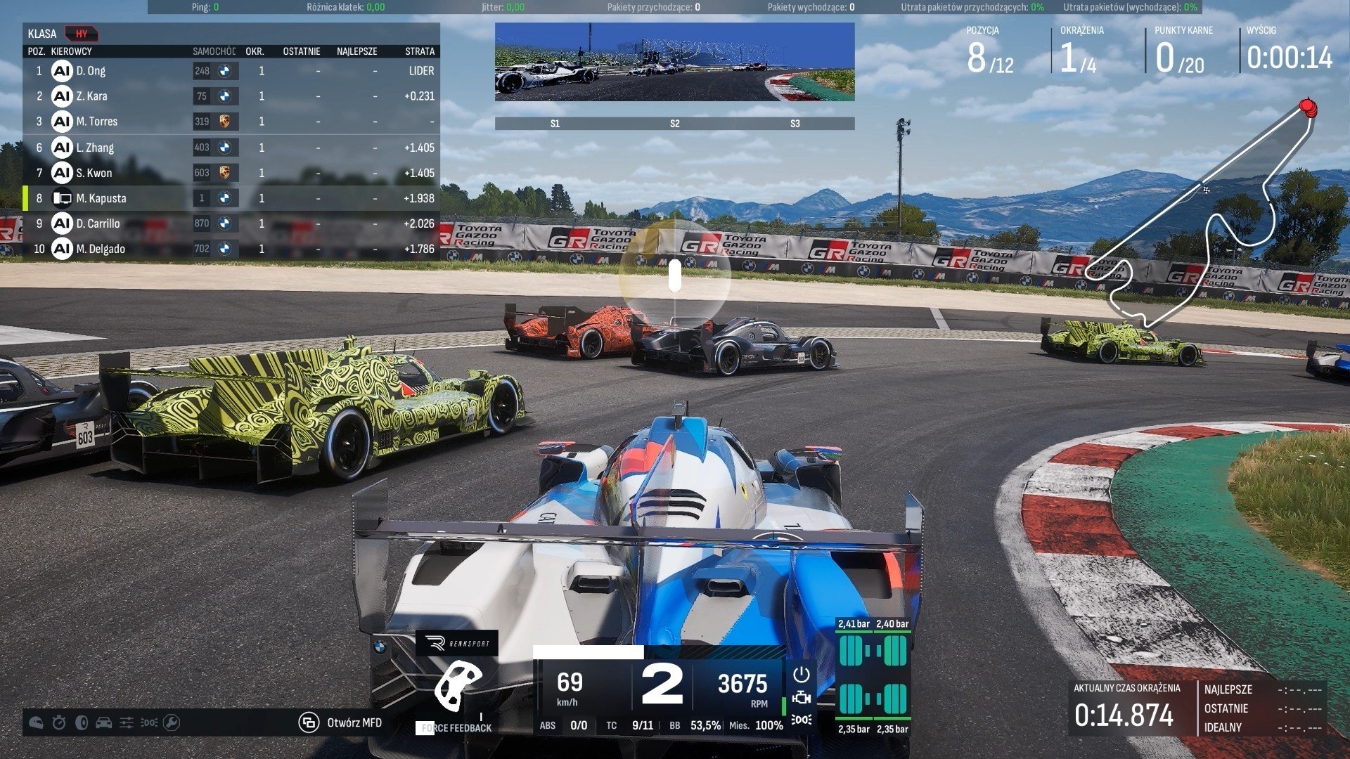 Do czego zmierzam. W pewnych modelach zachowanie pojazdu w środku zakrętu zdaje się być całkiem realistyczne, ale w innych ten aspekt wypada bardzo nienaturalnie, zwłaszcza podczas przeniesienia masy np. w szykanach. Niektóre samochody zachowują się wtedy bardzo dziwnie, czasem wręcz nieprzewidywalnie, przez co trudno było mi na pewne rzeczy reagować. Kąt skrętu przy niektórych autach potrafi być przesadzony w jedną lub w drugą stronę. Raz ciężko się wyrobić, a innym razem trzeba delikatnie obchodzić się używanym kontrolerem podczas skręcania, żeby nie złożyć się w pół. Oczywiście auta mają różny promień skrętu, wiadomo, ale tutaj wszystko wydaje się być nienaturalne, zwłaszcza względem innych, dopracowanych simów. Tutaj zaznaczę, że grałem zarówno na padzie jak i kierownicy, przy czym pochwalę całkiem niezły Force Feedback na kole. Co ciekawe, gra nie wykrywała DualSense na którym najbardziej lubię grać, więc musiałem korzystać z pada od Xboxa, ale chociaż z kierownicą od Simagica nie było żadnych problemów.