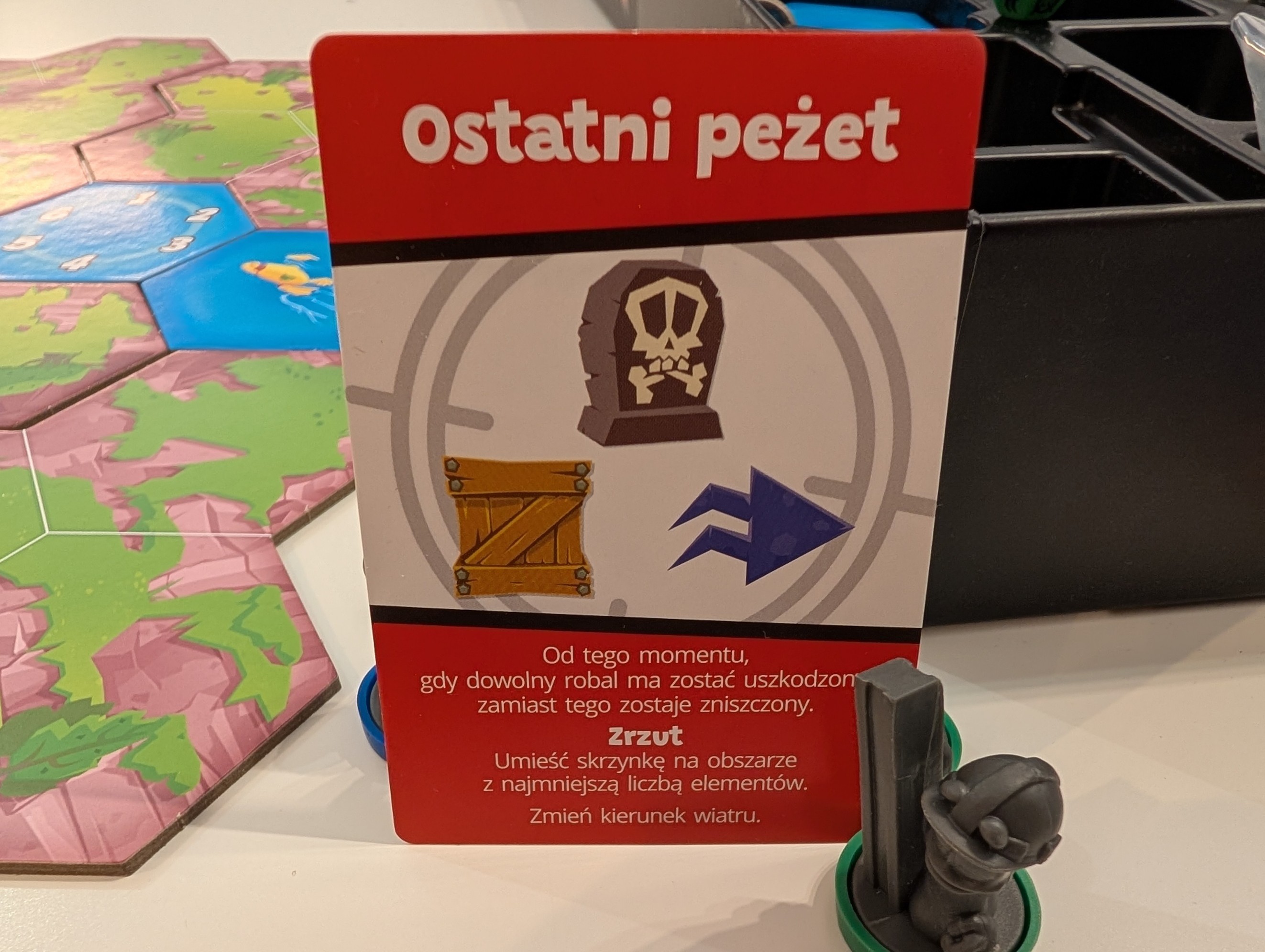 Żetony min, beczek i skrzynek to też eleganckie figurki, a nie tylko kawałki tektury. Mapa jest dobrze wykonana, karty na ładnym materiale, pudełko ma od razu dobry insert, a żetonów nie zabraknie. Pod tym względem jest super! Tylko że nie mam pojęcia jak przez korektę przeszły okazjonalne literówki, niektóre (patrz wyżej) naprawdę grube.