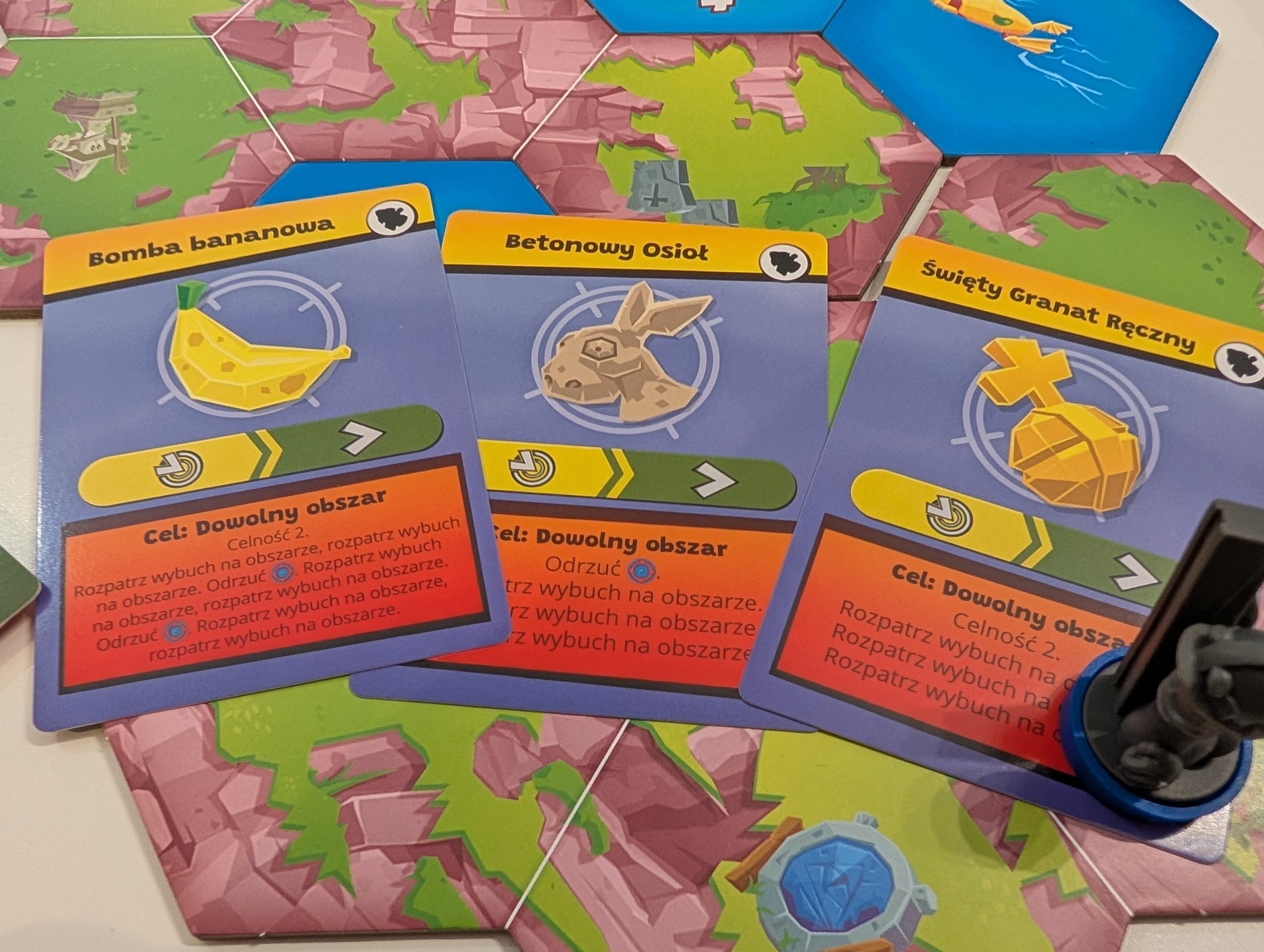 Arsenał jest naprawdę konkretny i w talii kart znajdziemy większość kultowej broni. Zwykłe uzi czy pistolet to gwarantowane trafienie, ale nie robiące przesadnych szkód. No chyba że trafimy w minę, która trafi w beczkę, która trafi w minę… Ale taki Święty Granat Ręczny to gwarantowana destrukcja całego pola. O ile trafimy. W tej kwestii gra planszowa doskonale oddaje klimat oryginalnych gier. A propos klimatu – nie zabrakło też bardzo ważnej mechaniki. Regularne działania wojenne i eksplozje na danym obszarze w końcu sprawią, że ów obszar zniknie, a pojawi się za to woda. A w wodzie to pływają ryby i toną robale.