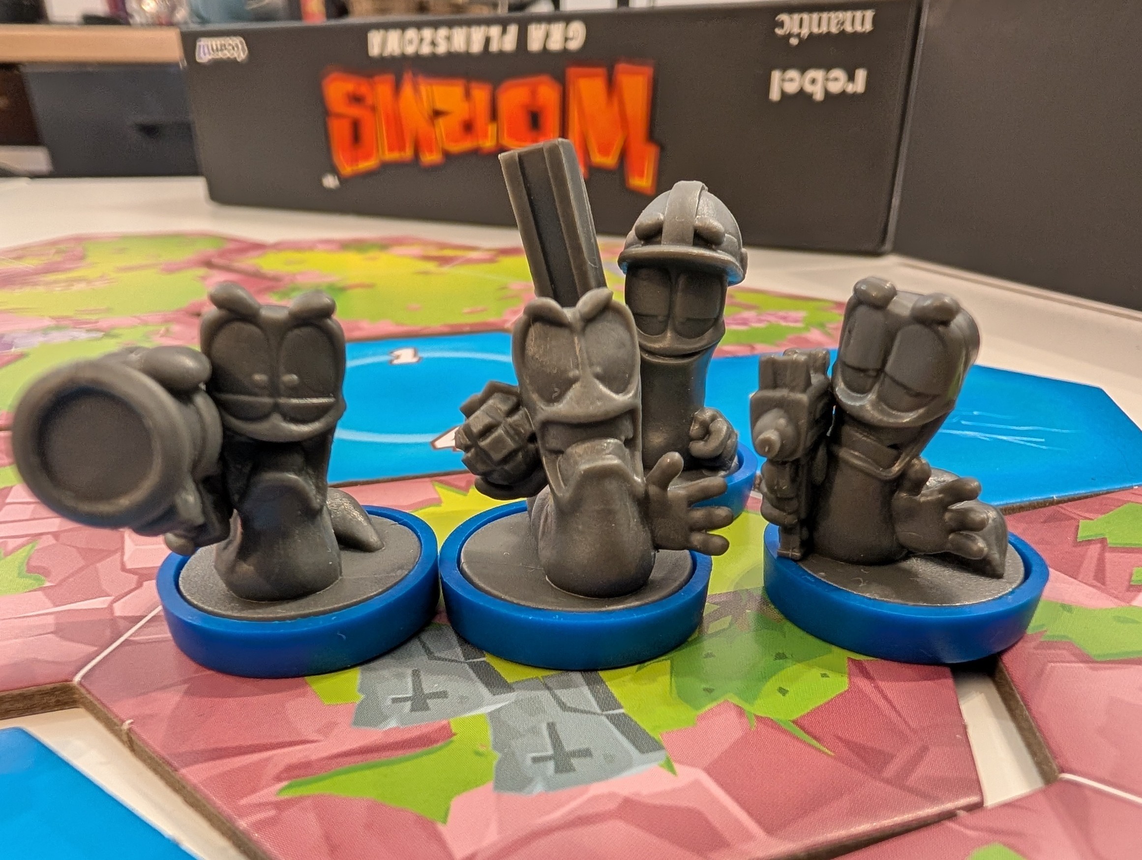 Ale żeby nie było, że tylko narzekam. Worms – Gra Planszowa to bardzo ładny tytuł. Grafiki prosto z gry komputerowej ucieszą każdego fana. A do tego mamy figurki robali, w dodatku po cztery na drużynę. Aż proszą się o pomalowanie, jeśli ktoś czuje się w tym dość pewnie.