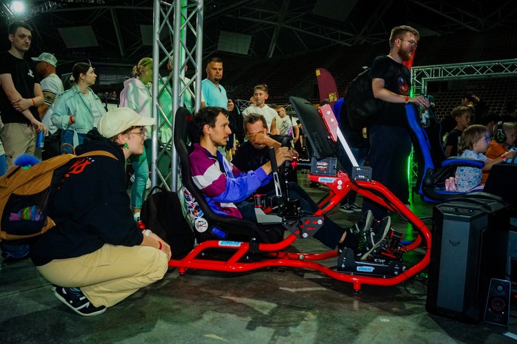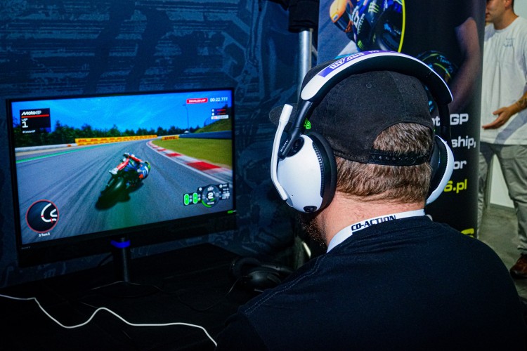 … tuż obok można było sprawdzić swoje umiejętności grając w MotoGP 25. Jak się okazuje, produkcja okazała się aż nad to wymagająca, ale było kilka zawziętych osób, które ze wskazówkami Gucio1846 próbowały opanować potężne motocykle. Osoby, które chciały poczuć się jak w prawdziwym samochodzie wyścigowym, mogły skorzystać z zaawansowanego symulatora samochodowego od Rabbit Trip, który potrafił wymęczyć niejedną silną personę. Mimo wszystko, możliwość obcowania z trudnymi wyzwaniami była bardzo kusząca dlatego, kolejka do jazdy przekraczała nasze najśmielsze oczekiwania.