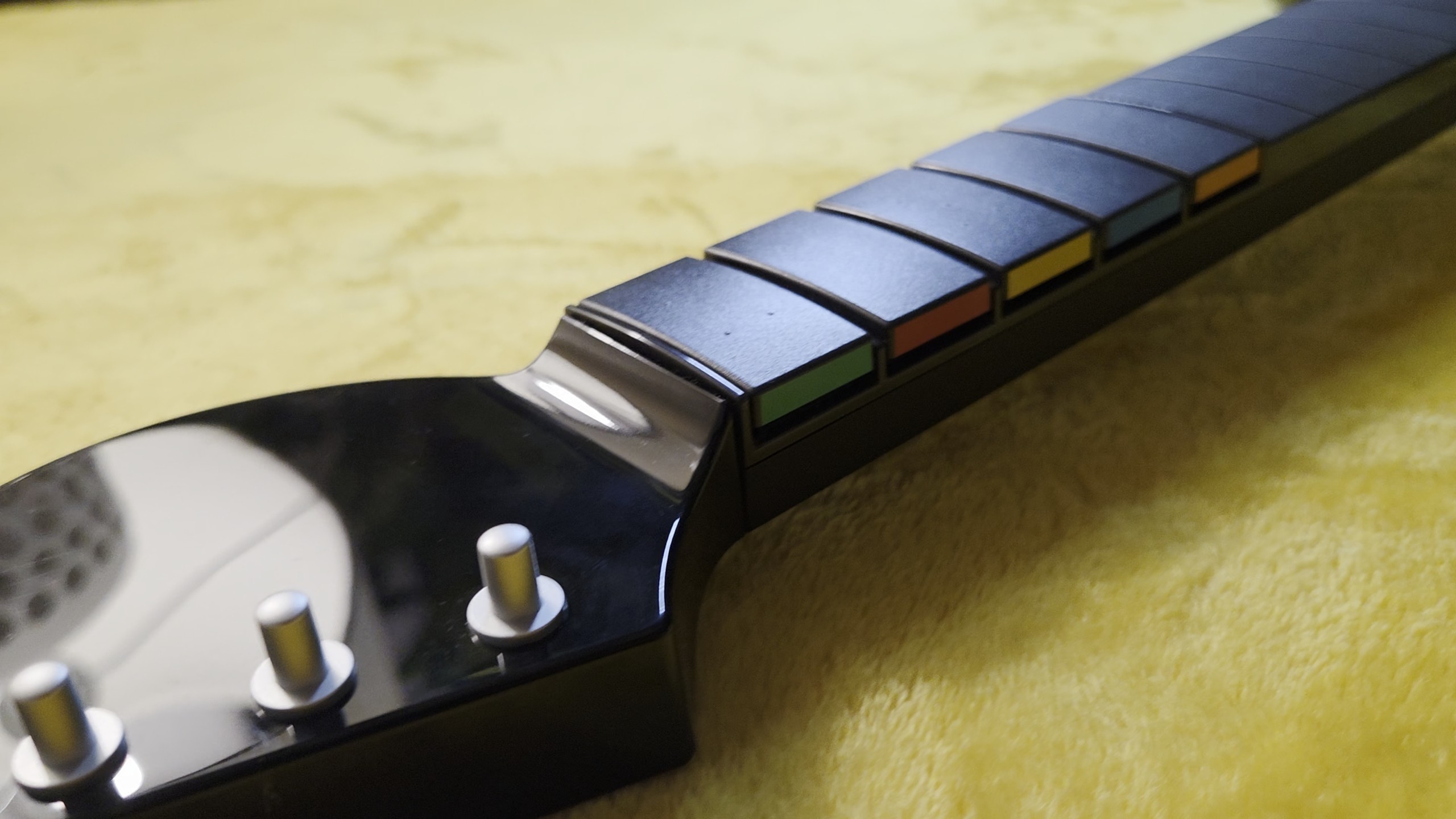 Tak oto wylądowałem z gitarą w rękach i MotoGP na ekranie. Po drugiej stronie gryfu, na wysokości szerszych, głównych przycisków, znajduje się odpowiednik lewego analoga. Po szybkiej konfiguracji sterowania w grze, spokojnie mogłem się pościgać za pomocą gitary i przyznaję, że choć z początku było to dość trudne zadanie, tak z czasem, gdy już się przyzwyczaiłem, grało się nie gorzej niż na podstawowym padzie – po prostu inaczej trzeba było się ułożyć. Jako że PDP Riffmaster jest wykrywany jako normalny kontroler, to możecie na gitarze zagrać w bardzo wiele tytułów, o ile chce wam się tak bawić. Pewnie nie, ale wiedzcie, że takie szalone opcje są możliwe, więc jeśli złapiecie ochotę na zagranie w nietypowy sposób w Mario, gry jRPG lub jakieś przygodówki, które nie wymagają obsług prawej gałki (to istotne, bo gitara jej nie ma), to PDP Riffmaster sprawdzi się tu doskonale.