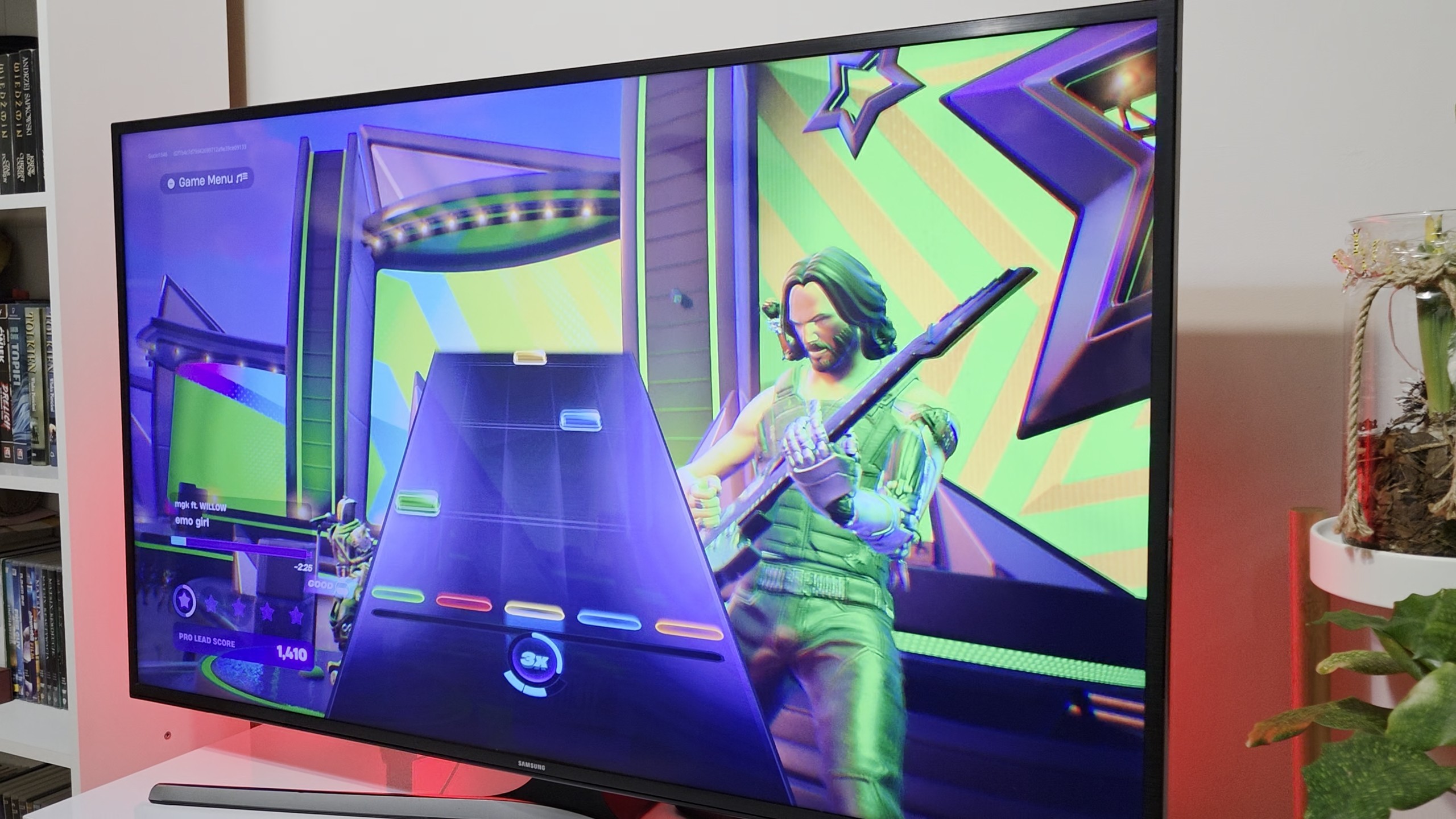Przejdźmy zatem do samego grania, bowiem tak naprawdę tutaj jest największy problem i paradoksalnie nie dotyczy on samego kontrolera PDP Riffmaster. Rzecz w tym, że na Nintendo Switch nie ma żadnych, typowo gitarowych gier… Jedyną opcją, aby zostać gwiazdą rocka jest zatem Fortninte Festival. No dobrze, jest jeszcze bijatyka God of Rock, ale pozwolę sobie ten temat przemilczeć. Tak czy inaczej, do gitary się nie nadawała. Tak więc pobrałem Fortnite, wybrałem tryb Festival, przebrnąłem konfigurację pod kątem opóźnień (pamiętajcie, aby w opcjach gry włączyć “Enable Guitar Mode”) i wybrałem jedyną słuszną postać do takiej zabawy, czyli Johnny’ego Silverhanda z rodzimego Cyberpunka 2077. Idealny bohater do testów, prawda?