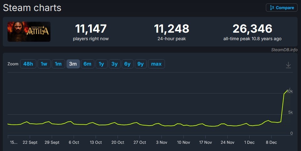 Z danych serwisu SteamDB wynika, że rekord wszech czasów Total War: Attila to 26 346 graczy jednocześnie, osiągnięty w dniu premiery. Dla porównania Total War: Rome II zanotowało 118 240 graczy w szczycie, a Total War: Warhammer 113 019. Na tle największych odsłon serii Attila od zawsze wypadała skromniej pod względem liczby aktywnych użytkowników. Mimo to gra przeżywa obecnie zaskakujący renesans. Został on zauważony przez użytkownika Reddita AceOfSpades0319, który 14 grudnia opublikował na subreddicie Total War zrzut ekranu pokazujący 11 147 aktywnych graczy i jest to najwyższy wynik od marca 2016 roku. Według autora posta bezpośrednim powodem wzrostu była premiera moda The Dawnless Days, który trafił na Nexus Mods zaledwie dwa dni wcześniej.