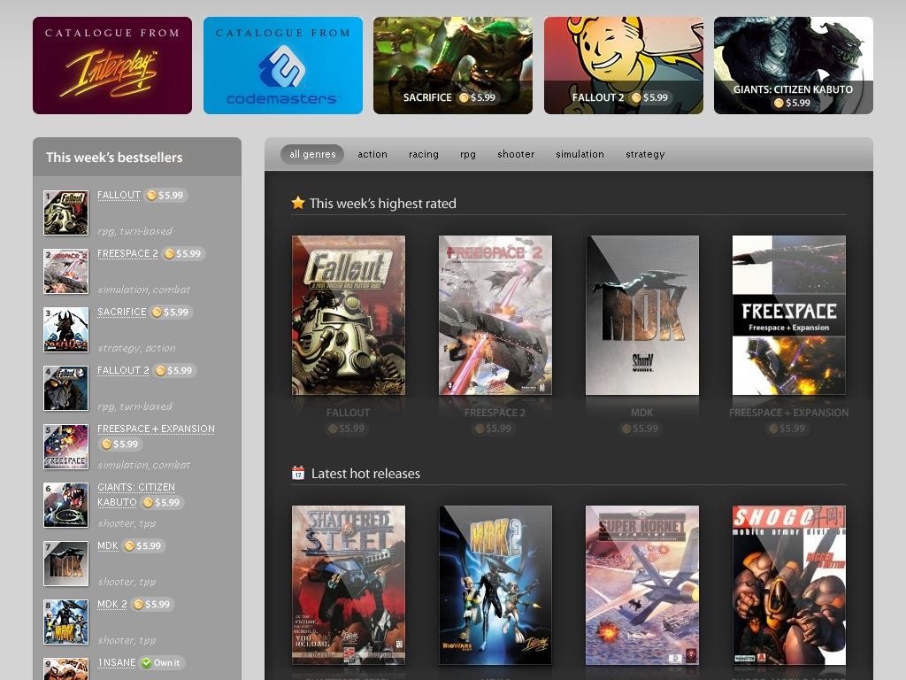 Good Old Games to przede wszystkim sklep. Czytelników interesuje zapewne, jak przedstawia się jego oferta. Otóż obecnie znajduje się w niej przeszło 30 pozycji, jednak przedstawiciele CD Projektu zobowiązali się jeszcze przed premierą platformy wyposażyć katalog w co najmniej 70, a być może nawet 100 tytułów. Mimo wszystko już teraz jest w czym wybierać. Coś dla siebie znajdą fani praktycznie wszystkich gatunków, a wśród gier można odszukać tak znamienite pozycje, jak Fallout, Jagged Alliance 2, Operation Flashpoint czy TOCA Race Driver 3. Każdy tytuł jest krótko opisany oraz zobrazowany na licznych screenshotach. Kompozycja kart katalogowych przedstawia się przyjemnie dla oka.