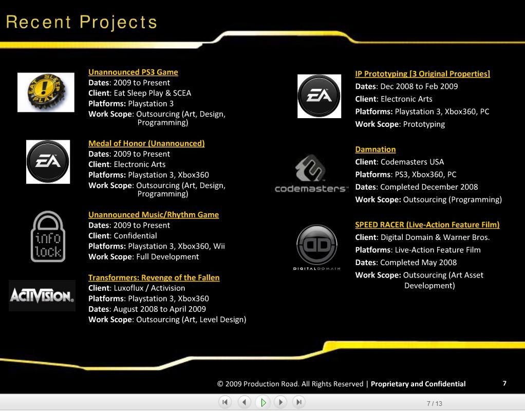 Production Road zajmuje się tworzeniem rozmaitych części składowych gier komputerowych na zasadzie outscoringu. Współpracują z nią największe koncerny z branży, jak np. Electronic Arts. Z broszurki tej firmy jednoznacznie wynika, że EA ma w zanadrzu nową odsłonę serii Medal of Honor.