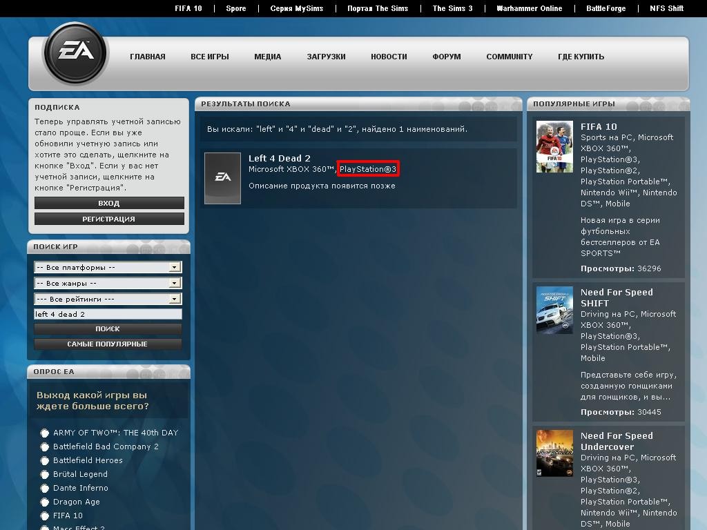 Zwyczajny błąd, czy nieplanowane ujawnienie ważnych (zwłaszcza dla właścicieli PS3) informacji? Rosyjska strona Electronic Arts podała, że Left 4 Dead 2 i Mass Effect 2 pojawią się również na konsoli Sony. O ile do tej pory BioWare nigdy wyraźnie nie zaprzeczył możliwości powstania wersji na PS3, o tyle przedstawiciele Valve z uporem maniaka twierdzą, że gry z tej serii powstają na konsolową wyłączność Xboksa 360.