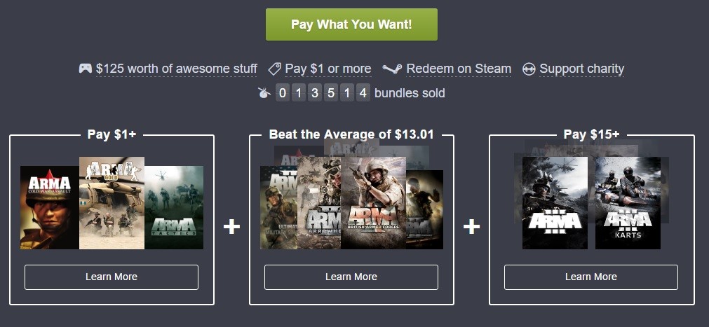 Jeśli zdecydujemy się na wpłatę kwoty większej, niż wynosi średnia wpłat (aktualnie jest to 13,01 dolarów, czyli około 53 zł), wtedy otrzymamy dodatkowo ARMA 2, ARMA 2: Operation Arrowhead, ARMA 2: British Armed Forces, ARMA 2: Private Military Company oraz ARMA 2: Army of the Czech Republic. Możemy także zainwestować minimum 15 dolarów. Wtedy dostaniemy wszystkie wspomniane pozycje oraz ARMA 3 i ARMA 3 Karts.