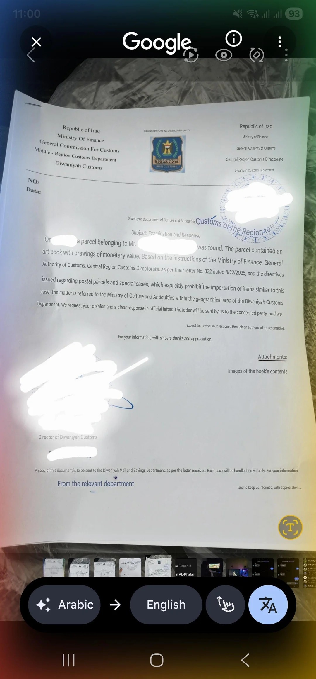 Urzędnicy uznali, że przedmiot wygląda na „zbyt stary”, i zarekwirowali go pod pretekstem podejrzenia o bycie nielegalnie wywożonym antykiem. Album został oficjalnie przekazany irackiemu Ministerstwu Kultury i Antyków oraz ekspertom z Muzeum Iraku w celu weryfikacji jego autentyczności.