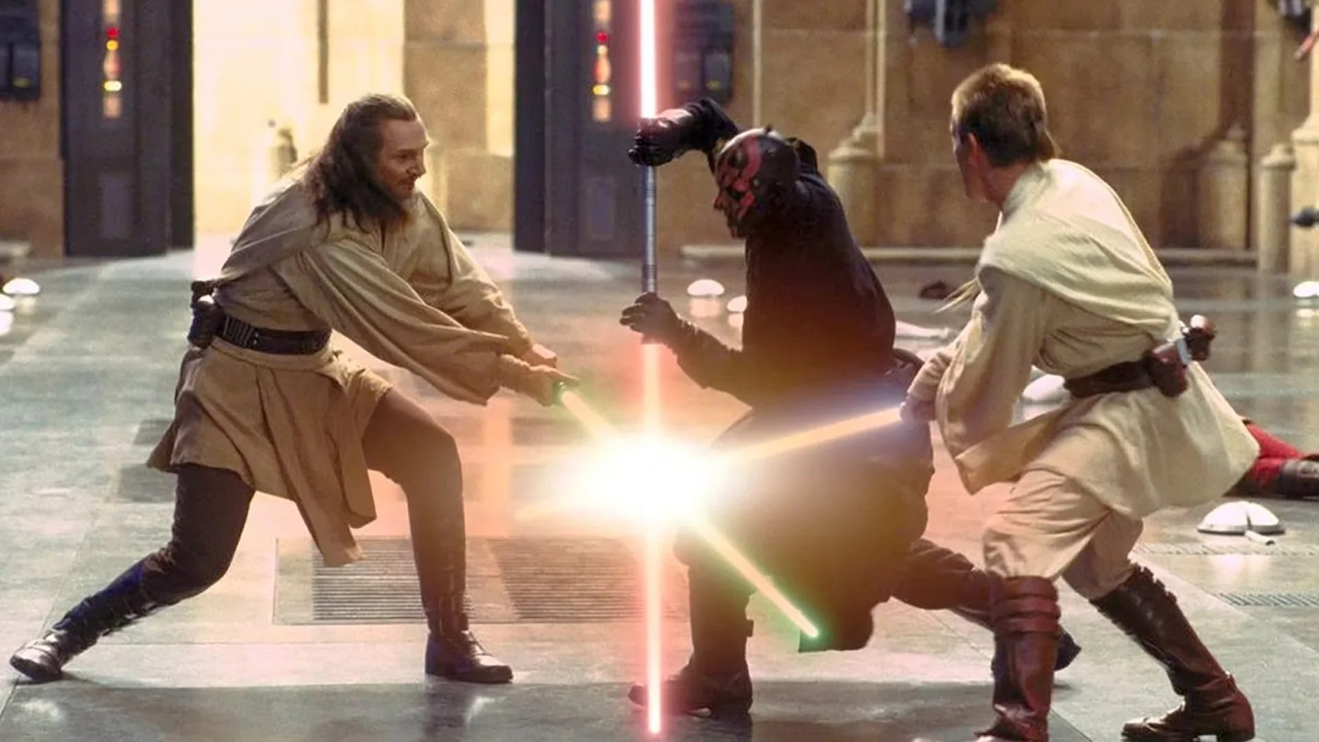 Starcie Obi-Wana Kenobiego z Darthem Vaderem było bardziej symboliczne, opierało się na oszczędnej choreografii i statycznej wymianie ciosów. Kolejne części oryginalnej trylogii, czyli Imperium kontratakuje i Powrót Jedi, znacząco poprawiły widowiskowość walk, zwłaszcza dzięki starciom Luke’a Skywalkera z Vaderem. Wciąż jednak brakowało pełnego pokazania potencjału Jedi jako wojowników działających w idealnej synchronizacji.
