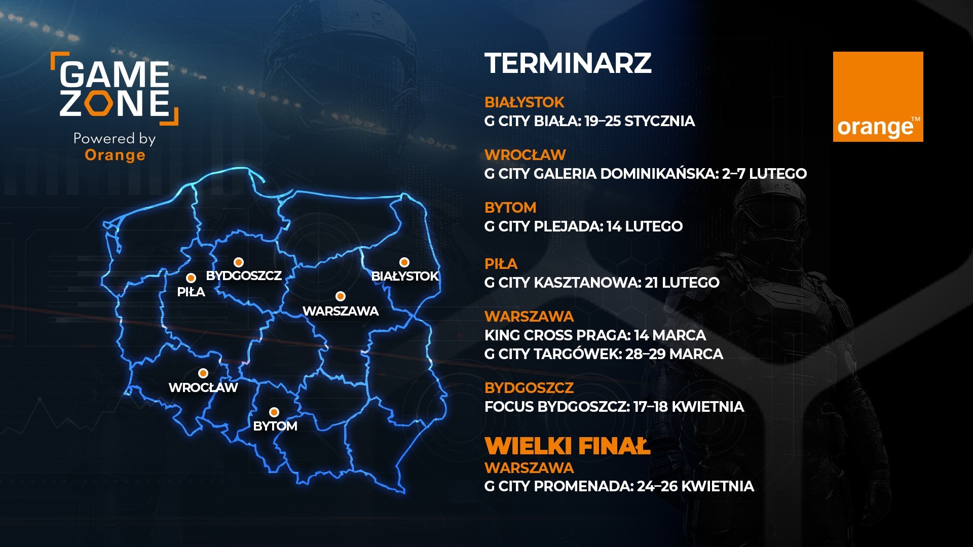 Od połowy stycznia do końca kwietnia 2026 roku potrwa trzecia edycja akcji GAME ZONE Powered by Orange – jednego z największych cykli wydarzeń gamingowych organizowanych w centrach handlowych. Tegoroczna trasa obejmie Białystok, Wrocław, Bytom, Piłę, Bydgoszcz oraz trzy lokalizacje w Warszawie, a jej kluczowymi punktami będą turnieje esportowe, strefy free-to-play i finałowe rozgrywki w stolicy.