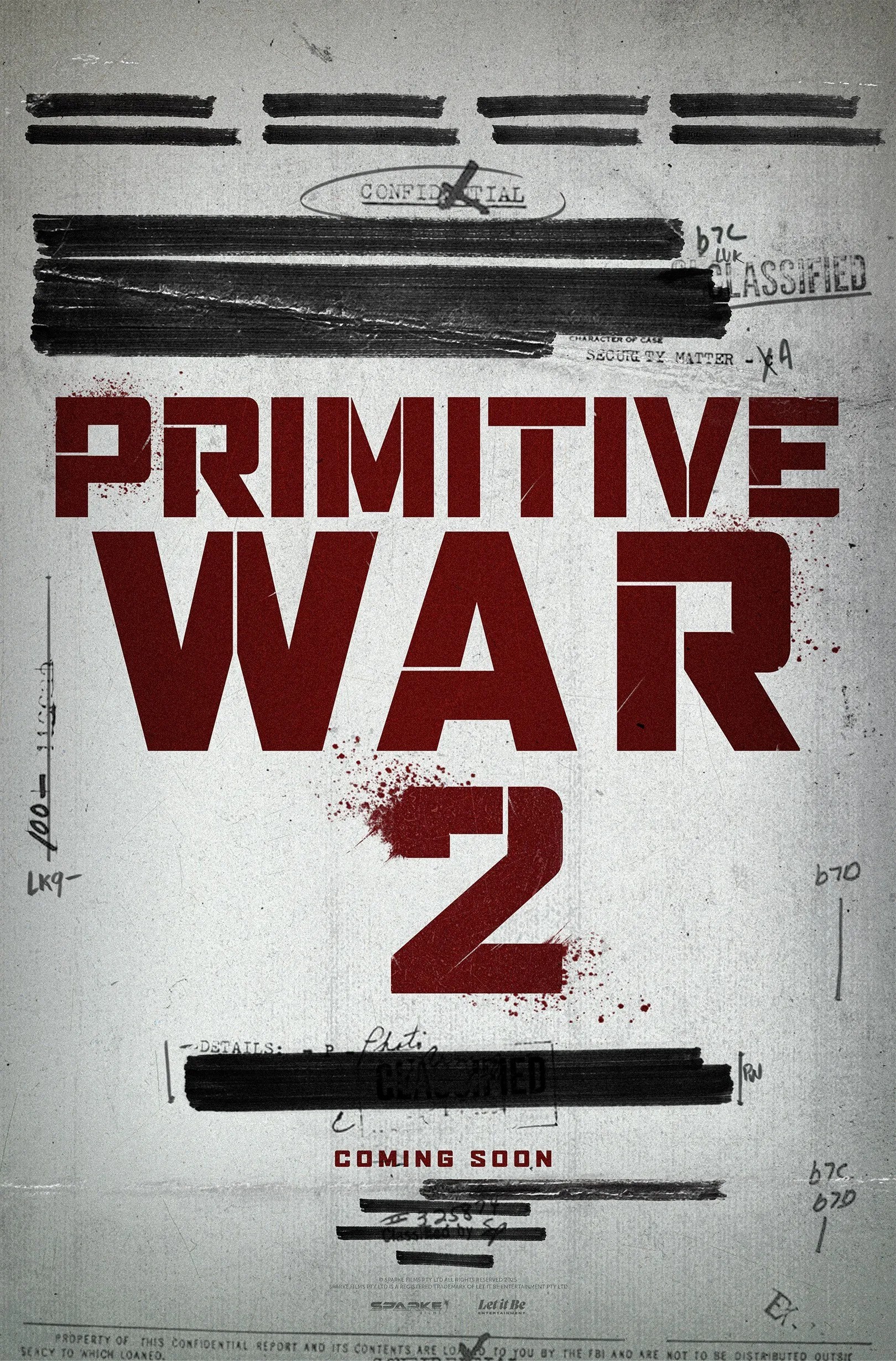 Produkcja znajduje się obecnie na zaawansowanym etapie przygotowań. Do pracy wracają także producenci Carmel Imrie i Carly Sparke, producent wykonawczy Geoff Imrie oraz współproducent Alex Becconsall. Premiera Primitive War 2 planowana jest na 2027 rok, ale film otrzymał już pierwszy plakat promujący widowisko.