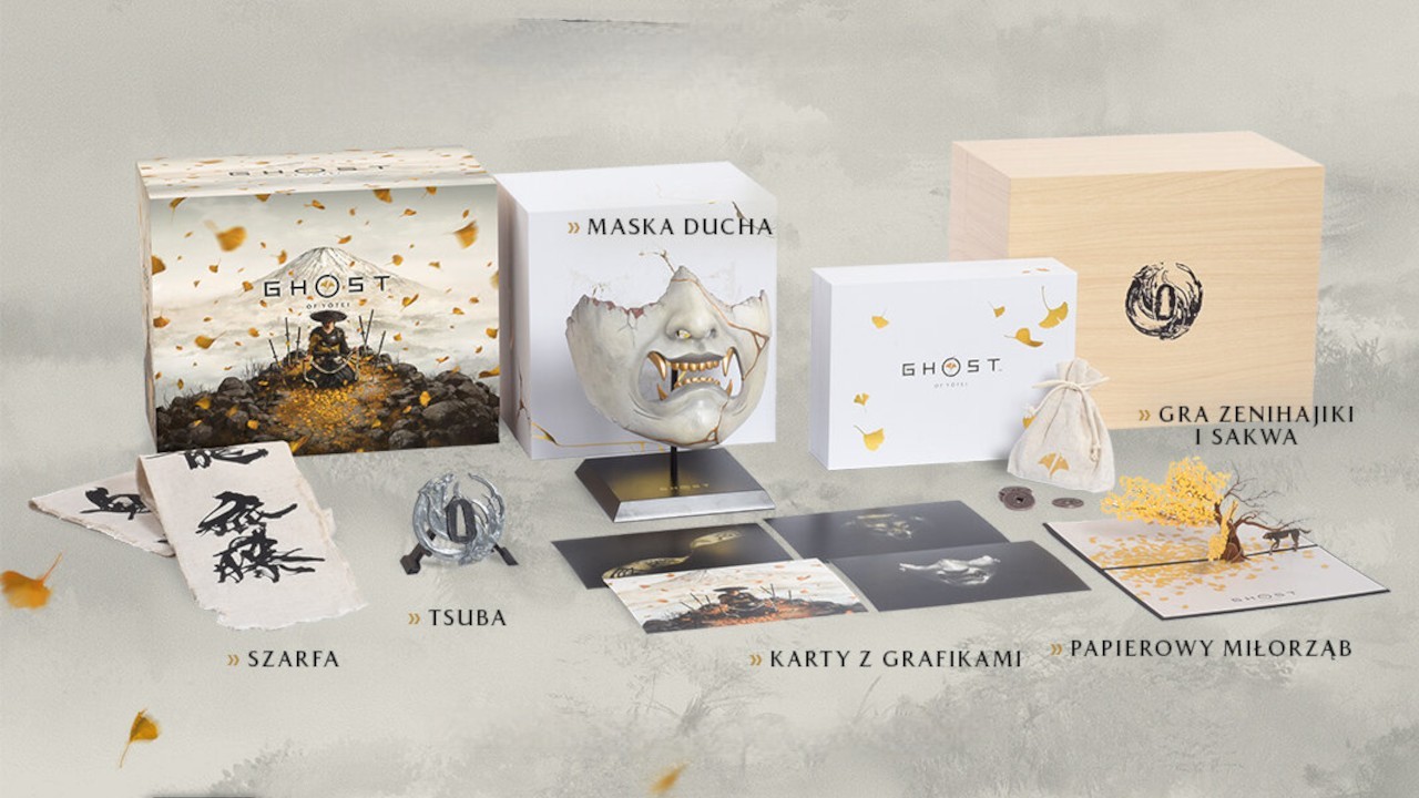 A co znajdziemy w Edycji Kolekcjonerskiej? Dodatki zarówno fizyczne, jak i cyfrowe. W tej pierwszej grupie znajdziemy maskę ducha, szarfę, tsubę, Papierowy Miłorząb, karty z grafikami oraz grę zenihajiki i sakwa. Do tego dochodzi pełna wersja Ghost of Yōtei oraz możliwe do wykorzystania w niej zbroja węża, barwnik do zbroi, koń i siodło, zestaw do ozdabiania miecza, mapy wędrowców oraz talizman.