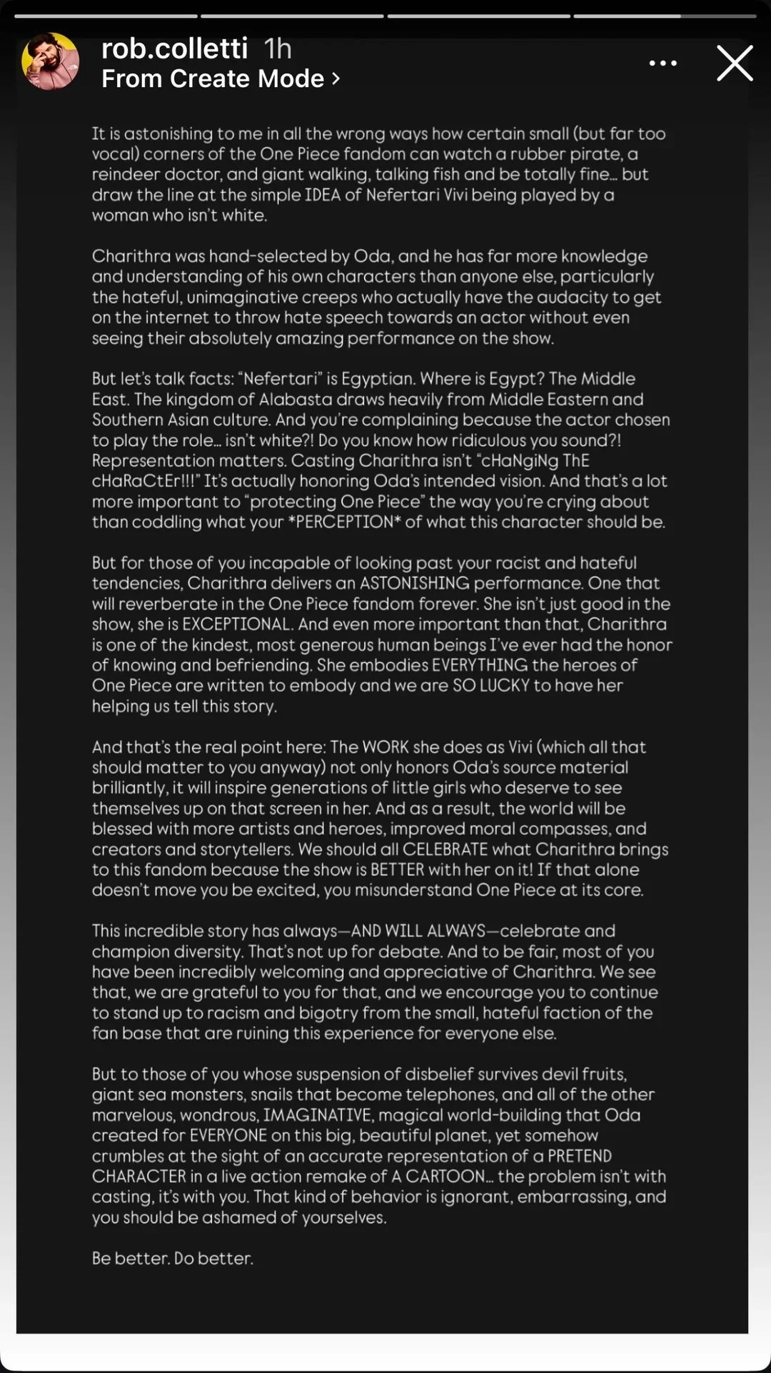 Dla tych, którzy nie potrafią spojrzeć poza swoje rasistowskie i pełne nienawiści uprzedzenia – Charithra daje ZACHWYCAJĄCY występ. Taki, który będzie rezonował w fandomie One Piece na zawsze. Ona nie jest tylko dobra w tym serialu, ona jest WYJĄTKOWA. Co jeszcze ważniejsze, Charithra jest jedną z najmilszych, najbardziej hojnych osób, jakie miałem zaszczyt poznać i zaprzyjaźnić się z nimi. Uosabia WSZYSTKO, co bohaterowie One Piece mają w sobie, i mamy OGROMNE szczęście, że pomaga nam opowiadać tę historię – napisał.