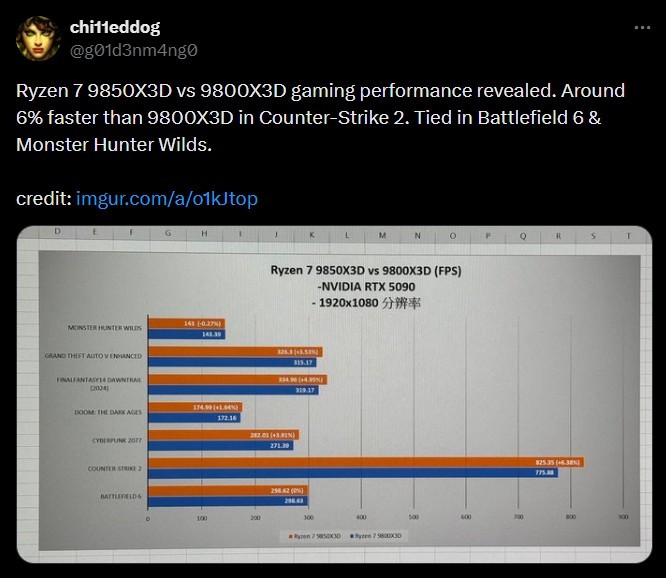 Nowy wykres benchmarków, przesłany przez informatora sprzętowego chi11eddog, pokazuje wydajność w grach procesora Ryzen 7 9800X3D w zestawieniu z Ryzenem 7 9800X.