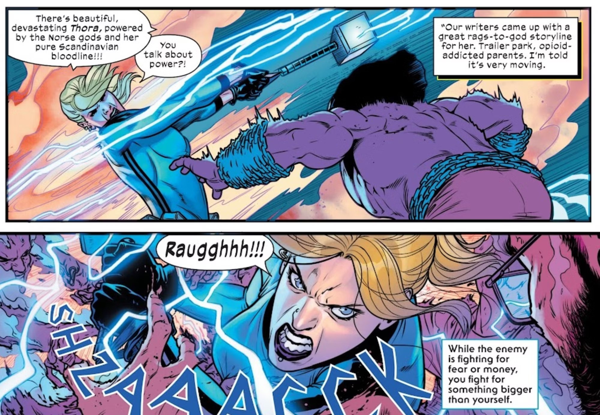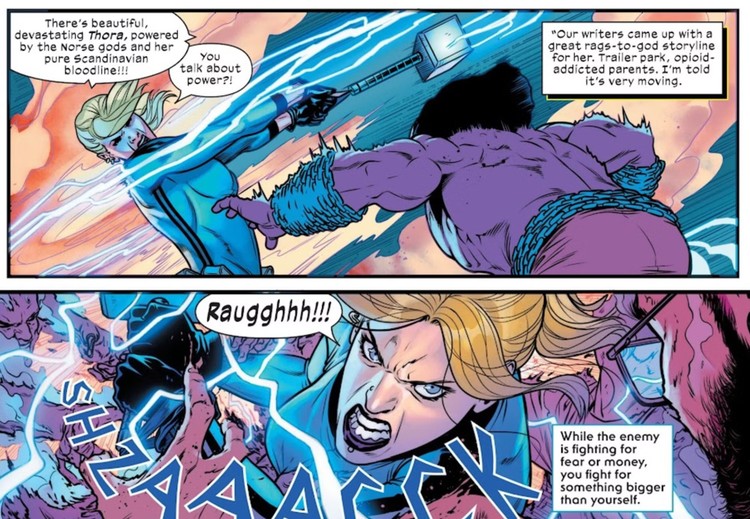 Nowa postać nie jest jednak klasyczną bohaterką. Thora jest zwolenniczką białej supremacji i symbolem wypaczenia idei superbohaterstwa. Włada młotem przypominającym Mjolnir, jednak pozbawionym zaklęcia godności. Dysponuje ogromną siłą i mocą błyskawic, lecz jej status boskiej wojowniczki budzi poważne wątpliwości.