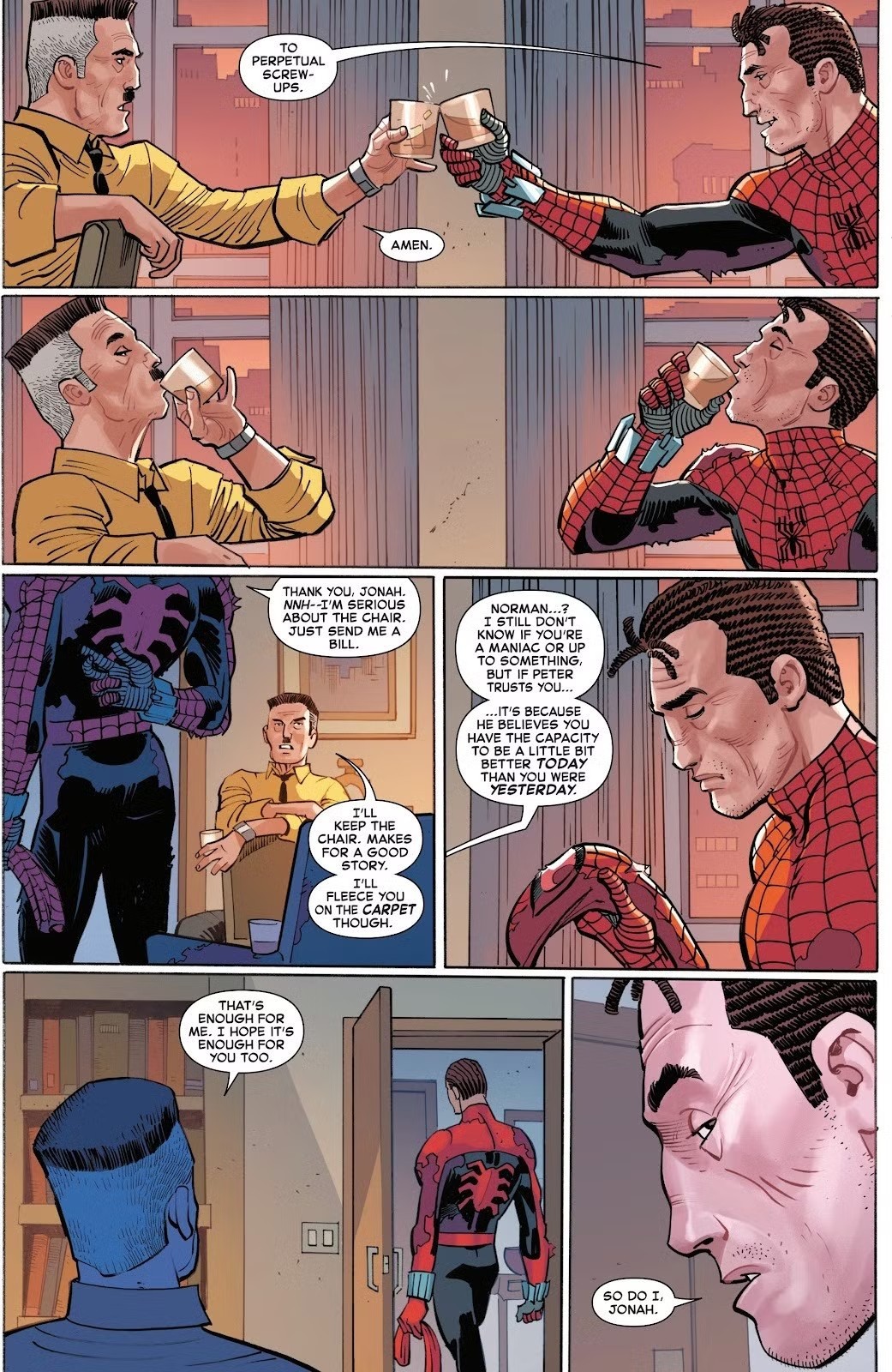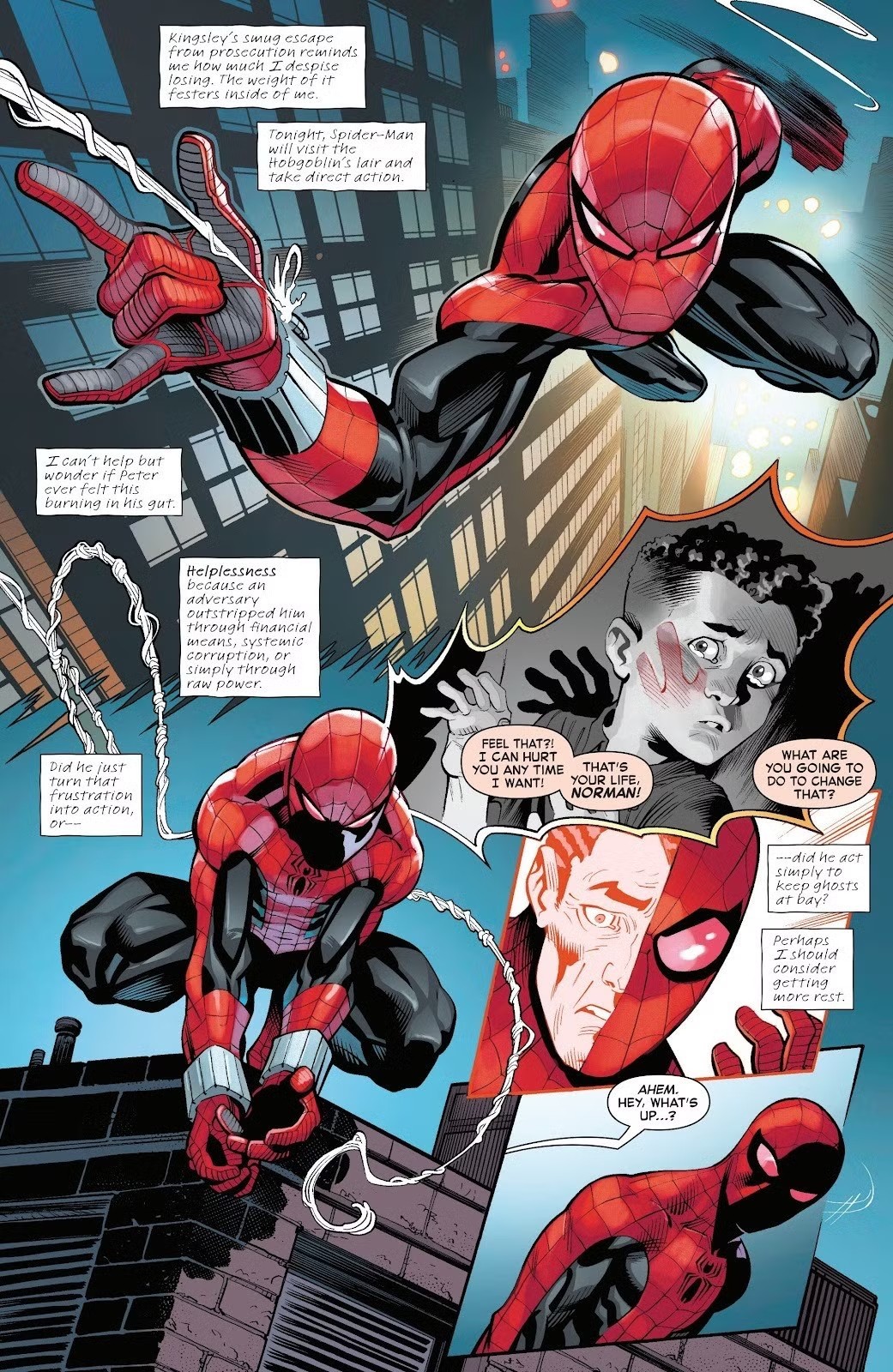 Sam Osborn określa siebie jako kapryśnego miliardera z nierozliczoną traumą, lecz jednocześnie uczy się, że bycie Spider-Manem to także rola lidera. W ostatnich zeszytach przewodził licznym Pająkom i Pajączycom, którzy towarzyszyli mu w drodze ku odkupieniu. Jego przemiana jest jednym z najciekawszych elementów obecnej serii, choć wciąż unosi się nad nią widmo powrotu do zła.