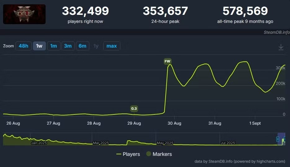 Path of Exile 2 znów znalazło się w centrum uwagi graczy. W miniony weekend liczba osób bawiących się jednocześnie na Steamie była niemal trzydzieści razy większa niż zazwyczaj. Według danych z serwisu SteamDB gra 31 sierpnia osiągnęła imponujący wynik ponad 353 tysięcy równoczesnych graczy, co jest największym skokiem aktywności od czasu premiery w grudniu 2024 roku.