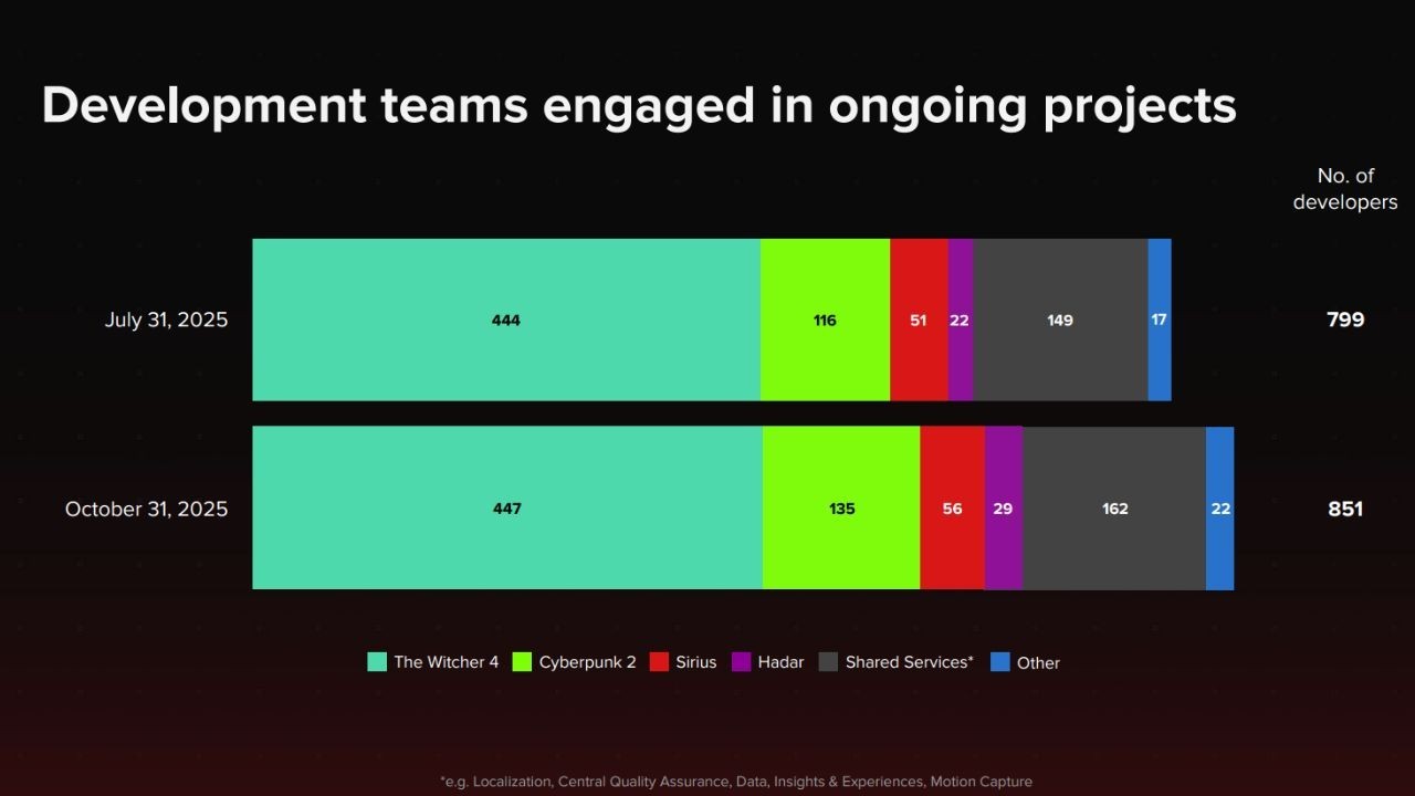 Prezentacja kwartalna szczegółowo określa, w jaki sposób 851 deweloperów zostało rozmieszczonych pomiędzy różnymi inicjatywami produkcyjnymi. Największa część zasobów ludzkich jest skoncentrowana na tworzeniu gry Wiedźmin 4, gdzie pracuje 447 deweloperów, co stanowi niewielki wzrost w porównaniu do 444 osób zatrudnionych przy tym projekcie w lipcu 2025 roku. Kolejnym istotnym przedsięwzięciem jest Cyberpunk 2, w którego rozwój angażuje się 135 deweloperów. Oznacza to znaczące powiększenie kadry, gdyż wcześniej nad projektem pracowało 116 osób.