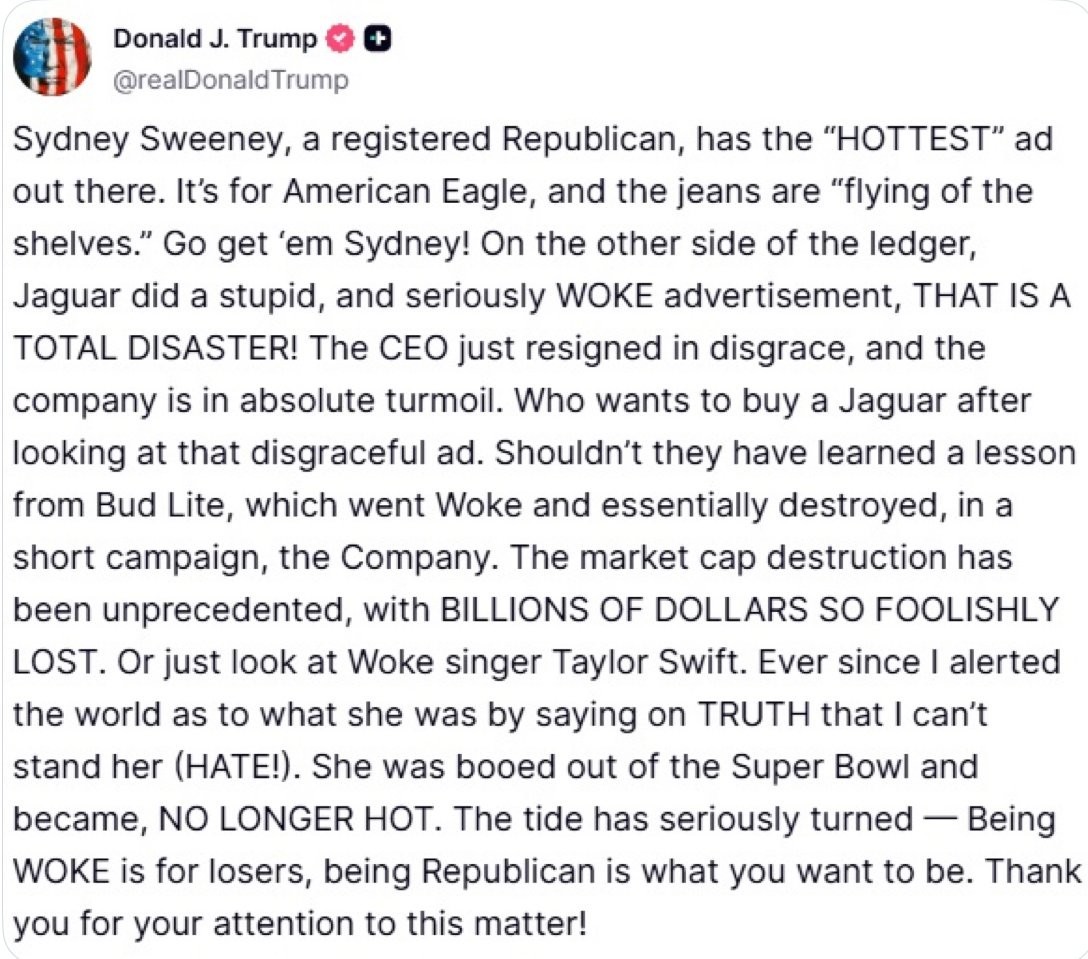 Jeśli Sydney Sweeney jest zarejestrowaną republikanką, uważam, że jej reklama jest fantastyczna. (...) To najgorętsza reklama jaką widziałem.